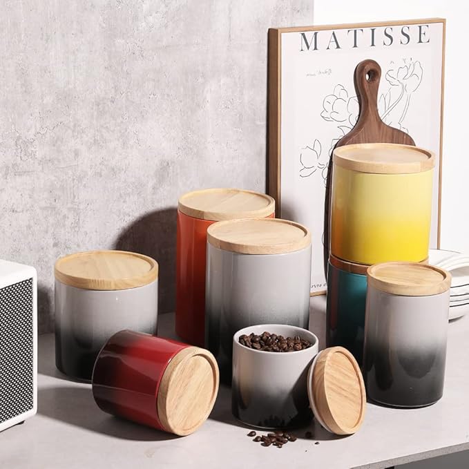 Sweejar Ceramic Food Storage Jar, Stackable Kitchen Canisters, Containers with Airtight Seal Wooden Lid for Serving Ground Coffee, Tea, Sugar, Salt and More - 16 Fl Oz (Gradient Gray)