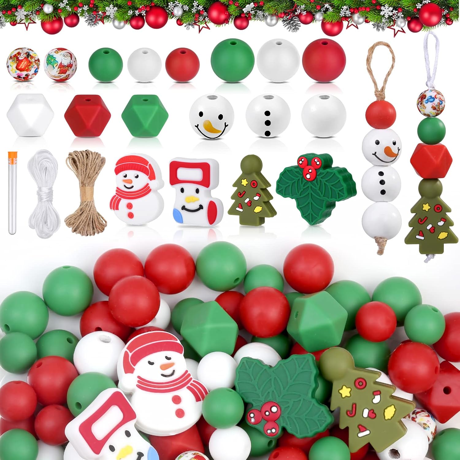• ๐‚๐ก๐ซ๐ข๐ฌ๐ญ๐ฆ๐š๐ฌ ๐›๐ž๐š๐๐ฌ ๐๐ฎ๐ฅ๐ค ๐Ÿ๐จ๐ซ ๐ƒ๐ž๐œ๐จ๐ซ Lucomb silicone beads contain 12mm 15mm of round rubber beads with 3 different colors (white, red, green), 14mm polygon silicone beads, 16mm white wooden beads, Christmas stocking shape, Snowman, Christmas tree, Leaves-shape silicone spacer beads, ropes, big eye beading needles. All the color of beads is classic and rustic, string these all up may be making garland lanyard and tassels or decorating somewhere in the house for Christmas Decoration.