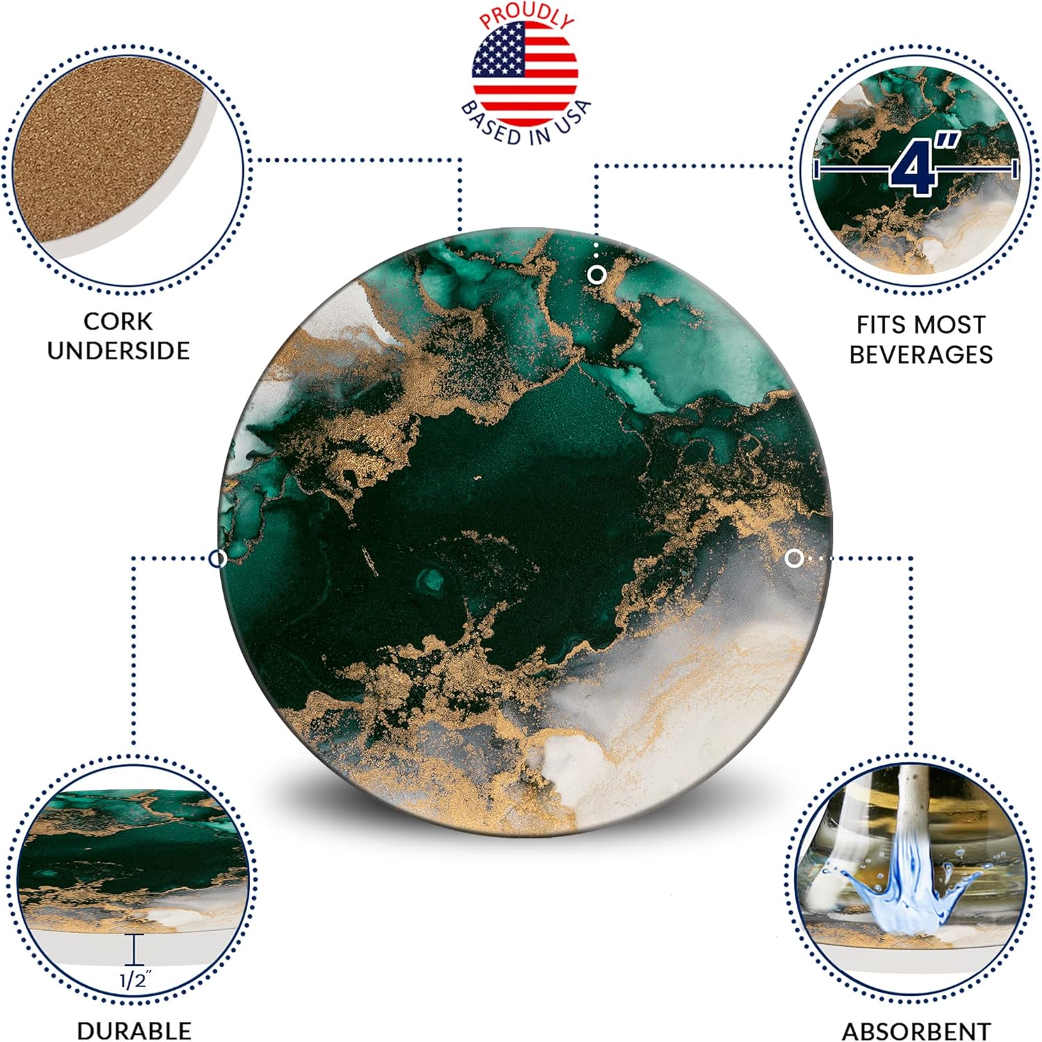 Emerson Coasters for Drinks Absorbent – Natural Stone Drink Coasters Set with Holder, Coasters for Coffee Table, Wooden Tabletop Protection Marble Style – 100% Heavy Duty Set of 6 (Green Forest)