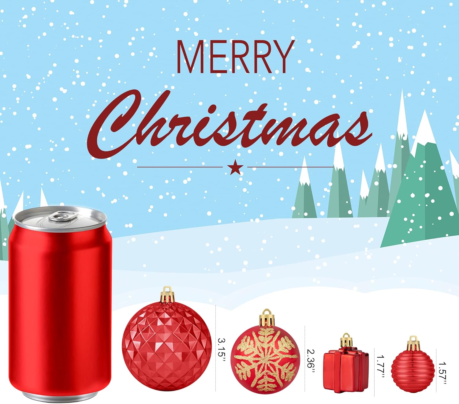 • 【Christmas Ball Ornaments】 This red and gold Christmas ornament set contains 116PCS of Christmas balls in 18 styles, includes various shapes, sizes, such as 1.57” / 2.36” / 3.14” Christmas ball, stocking , bell, and gift. It's your call to complete your Christmas decoration with these beautiful balls ornaments set, and make the Christmas season more memorable and unique