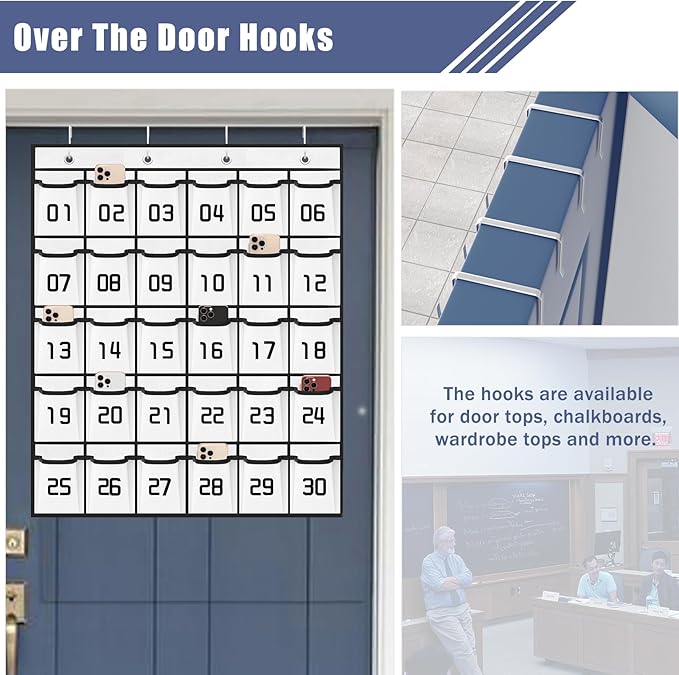 • 【4 Metal Hooks for Classroom Pocket Chart】 Calculator Phone pouch fit the top of whiteboard or over the door as thick as 1.3"-2", hanging organizer with pockets supports the weight of 30 phones (about 20 lb), easy to install and close the door.