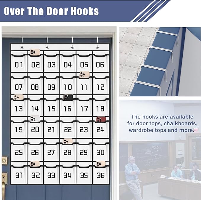 • 【4 Metal Hooks for Classroom Pocket Chart】 Calculator Phone pouch fit the top of whiteboard or over the door as thick as 1.3"-2", hanging organizer with pockets supports the weight of 36 phones (about 24 lb), easy to install and close the door.