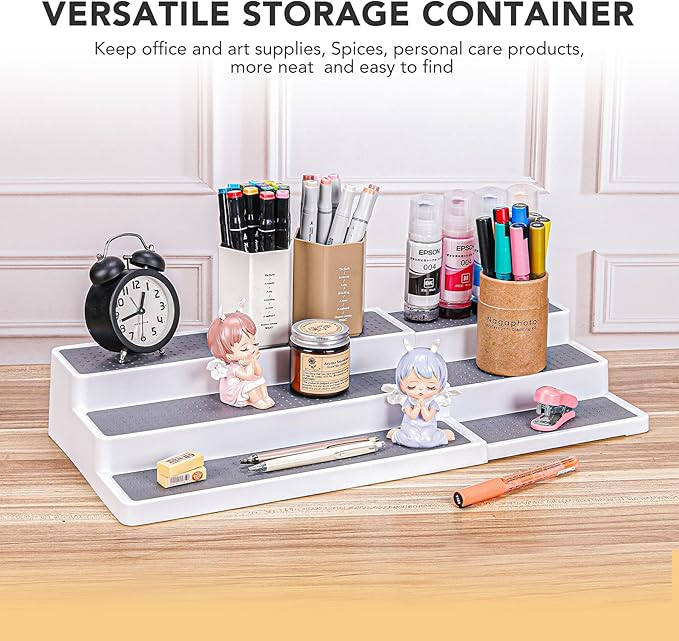 • Stepped Design - Our spice organizer has a stepped design to make it easier to find the herbs and seasonings.his tier spice rack can be used not only to store spices but also to organize and declutter your bedside drawer, your bathroom cabinet, your work desk, and even your other kitchen cabinets.