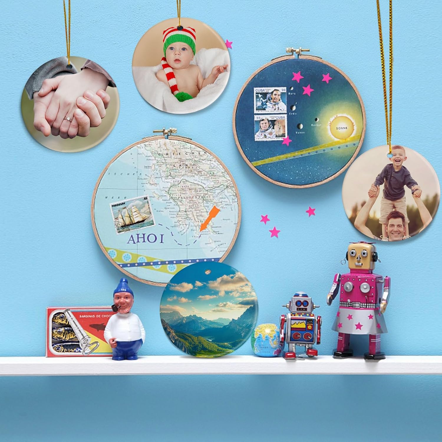 • 【Instruction Manual】:He porcelain ornament with quality sublimation coating on one -sides.Back of christmas-ornaments is uncoated for best writing results. UV printing, heat sublimation. UV printing requires the use of UV printing ink or Infusible ink. Sublimation Parameter Reference, temperature: 360 F, suggested time :250 S, suitable for sublimation printing by heat press machine.