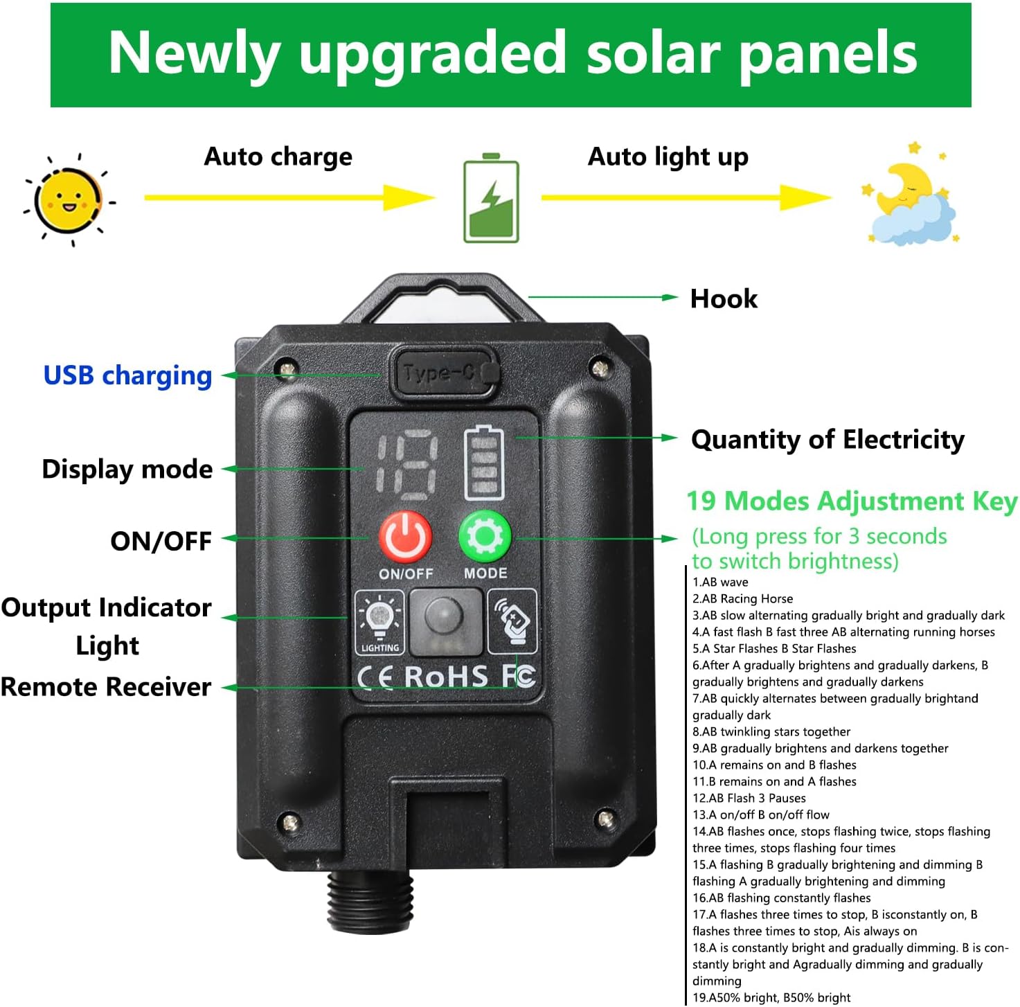 • 2.String Lights with Remote Control - Point the remote to the string lights, you can control the lights ON, OFF and lighting modes. And there are 19 different modes can be controlled by the button on the battery box.