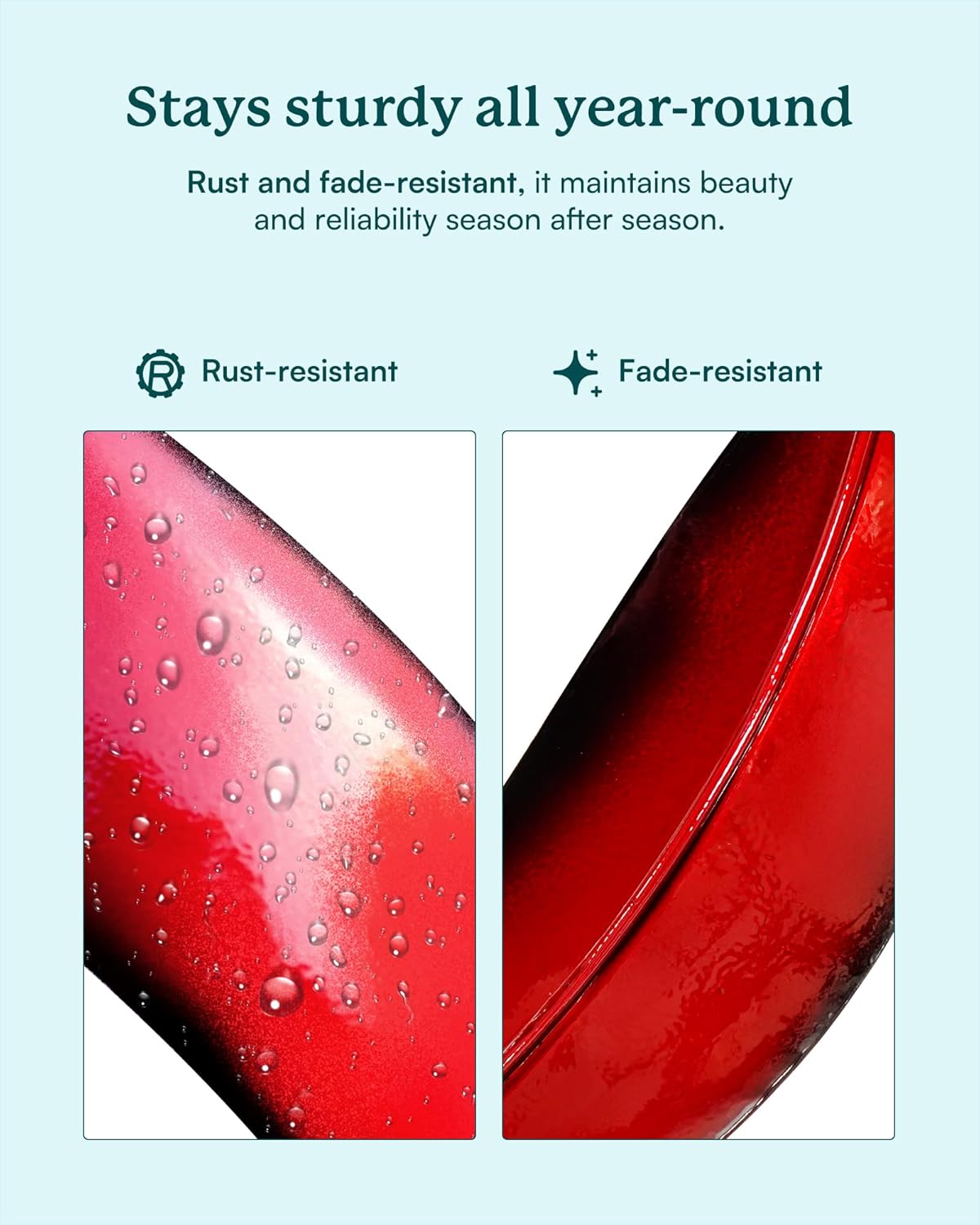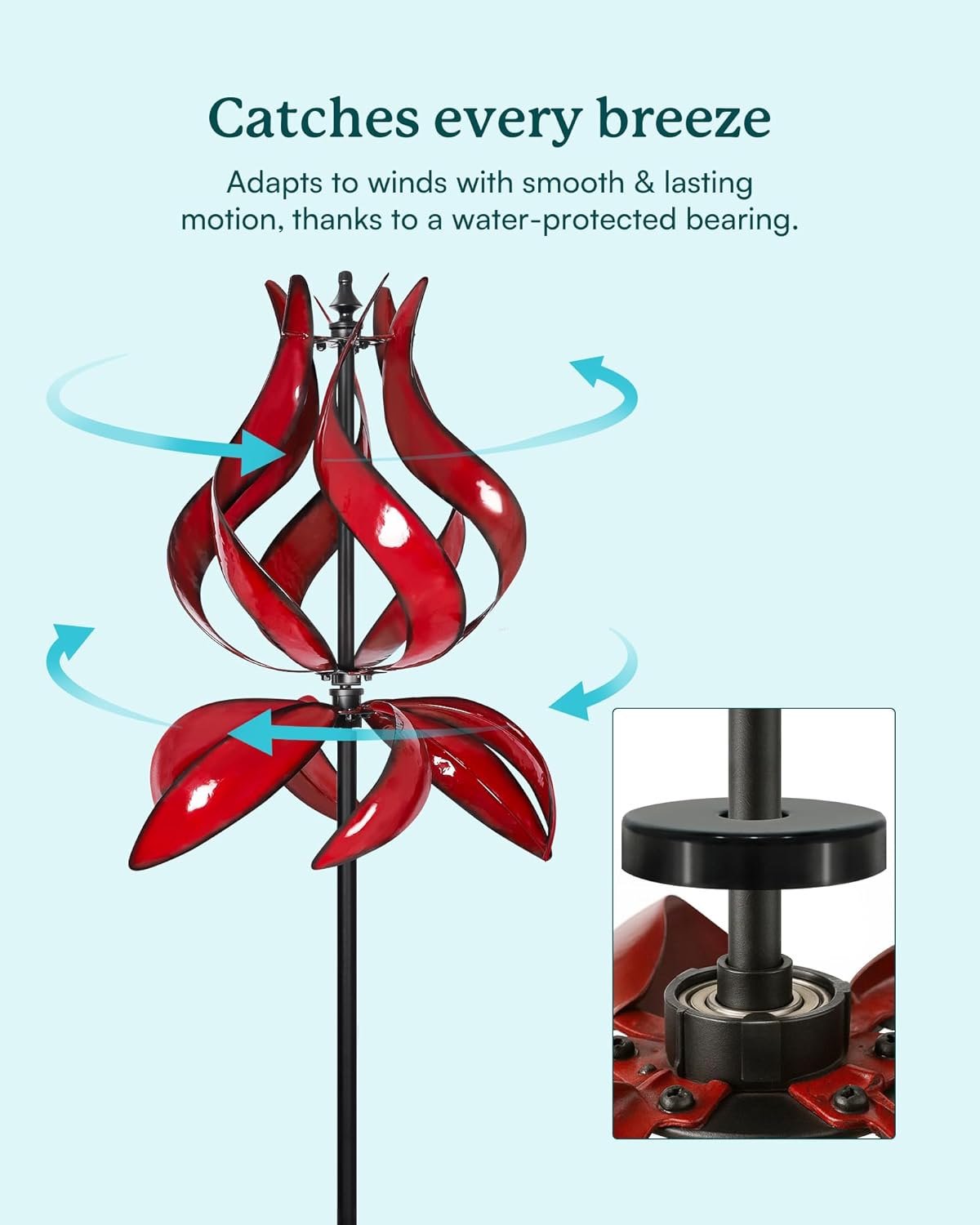 • BEAUTIFUL TULIP DESIGN: This stunning metal yard spinners features a lovely red finish and tulip design. Dual rotors spin independently and rotate 360 degrees. The kinetic yard wind spinners has thickened poles (diameter 22mm, 40% thicker than others) and stable metal stake with three prongs to ensure its firmly planted for windy days and against a snowy landscape.