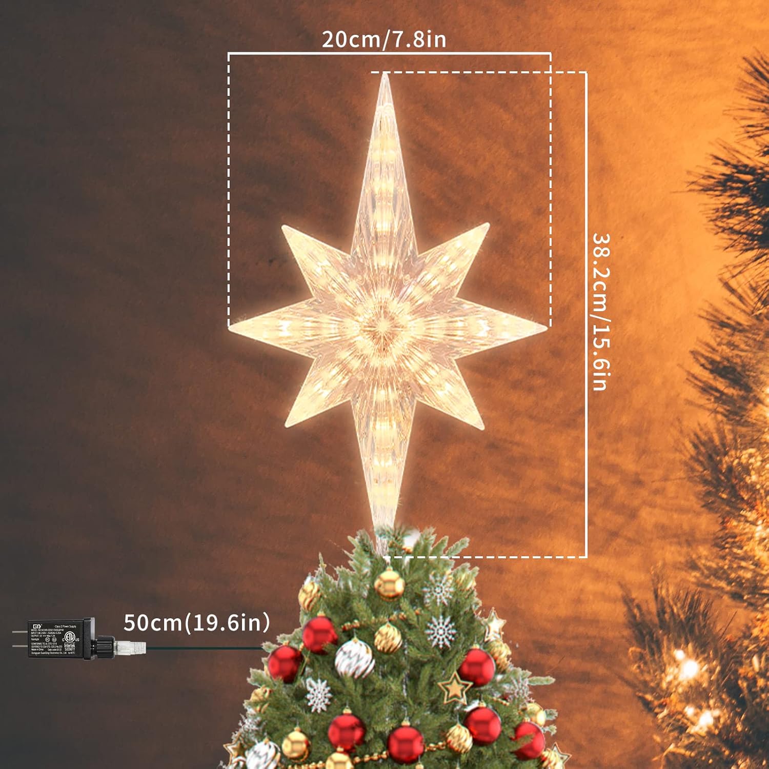 • This tree Bethlehem Star topper is 110V pulg in WORKING. This Bethlehem Star tree topper measures about 15.6 inch from top to bottom and 7.8 inch across, which is suitable for general size Christmas tree.