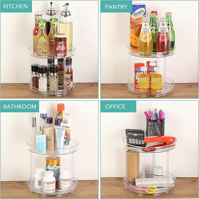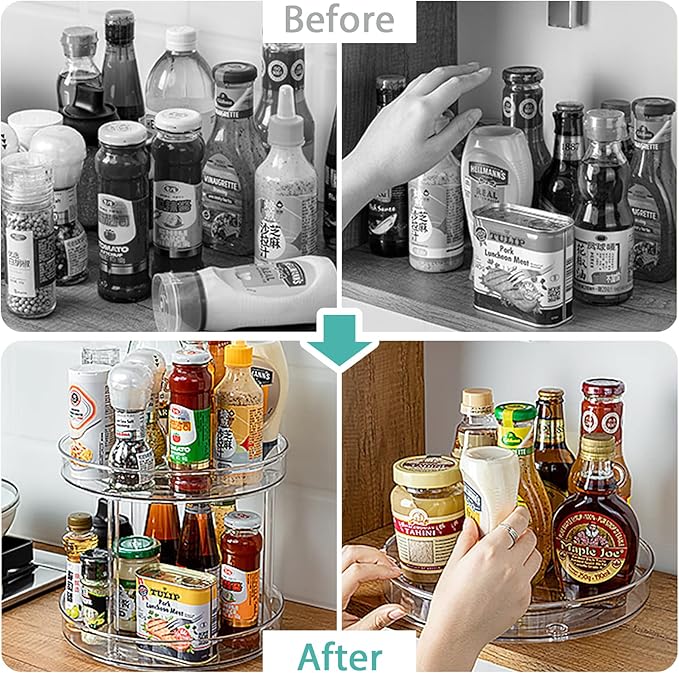 • Premium & Secure: The 2 tier lazy susan organizer is made of durable BPA-free plastic for years of quality use. It is more durable and does not require frequent replacement. Perfect clear turntable organizer for pantry organization and storage. Clean it with mild soap and water, do not place in dishwasher.