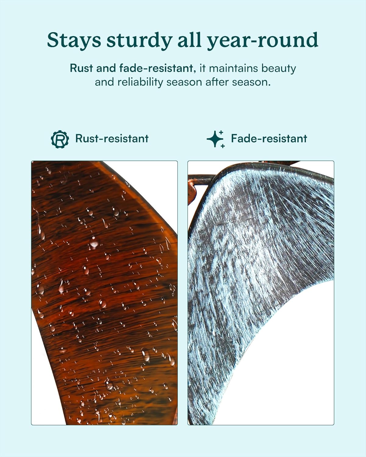 • SOLAR OUTDOOR METAL DECOR: Made of sturdy metal with protective coating finishes. UV, RUST, and FADE RESISTANT. The all-season decorative spinner can be cleaned easily to keep its reflective shine and rustic appearance. Long-lasting use.