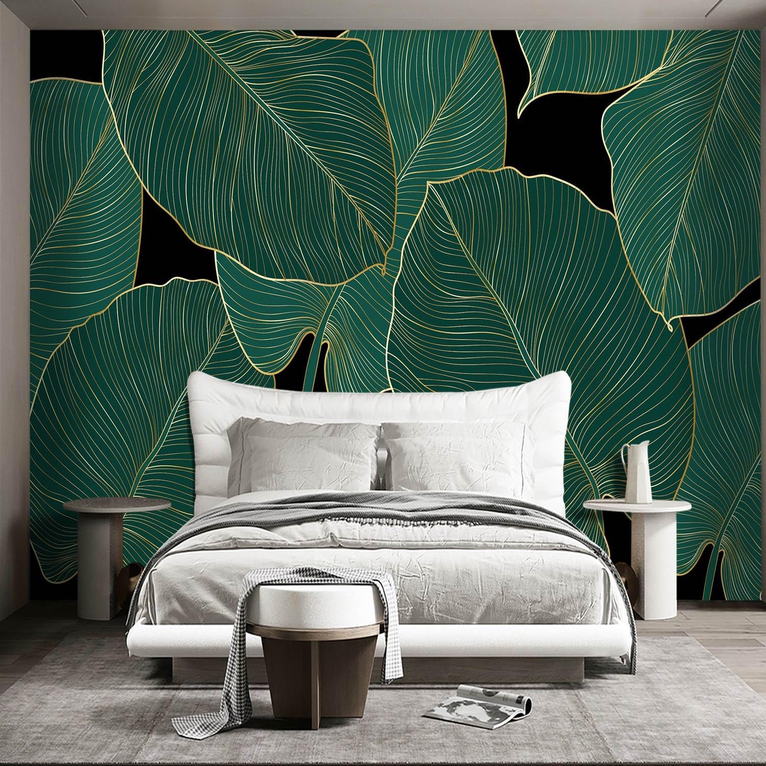 Black and Gold Leaf Mural Bedroom Tropical Green Botanical Wallpaper Room Plant Decor Living Room tv Background Large Wall Mural - 91"x65" (Not Peel and Stick)