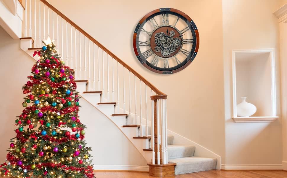 • Unique Design, Only For Your Home: Round solid Wood frame and classic retro skeleton with real mechanical moving gears in the central, the wooden frame is handcraft, showing unique attractive wood grain color and small natural knots; artificial rust-imitated treatment marks on the skeleton for vintage and industrial effect; stronger tempered glass resists any breakage and keeps safety whenever; The design is very different from other clocks, just to break the ordinary, only for your home