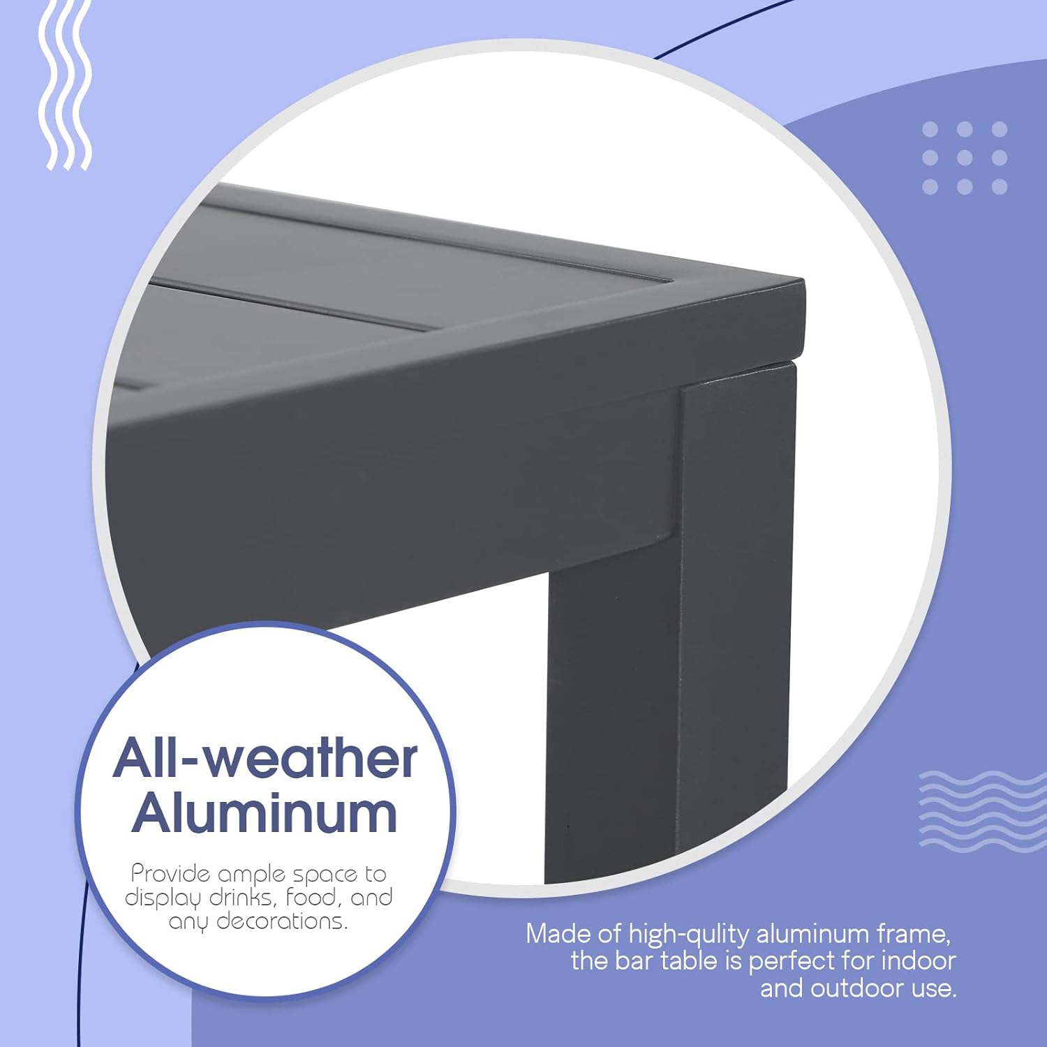 • DURABLE MATERIAL - Made of premium aluminum, the tall bar table is lightweight and rust resistant for long lasting durability. The caps on the feet increase stability and protect backyard furniture while moving.
