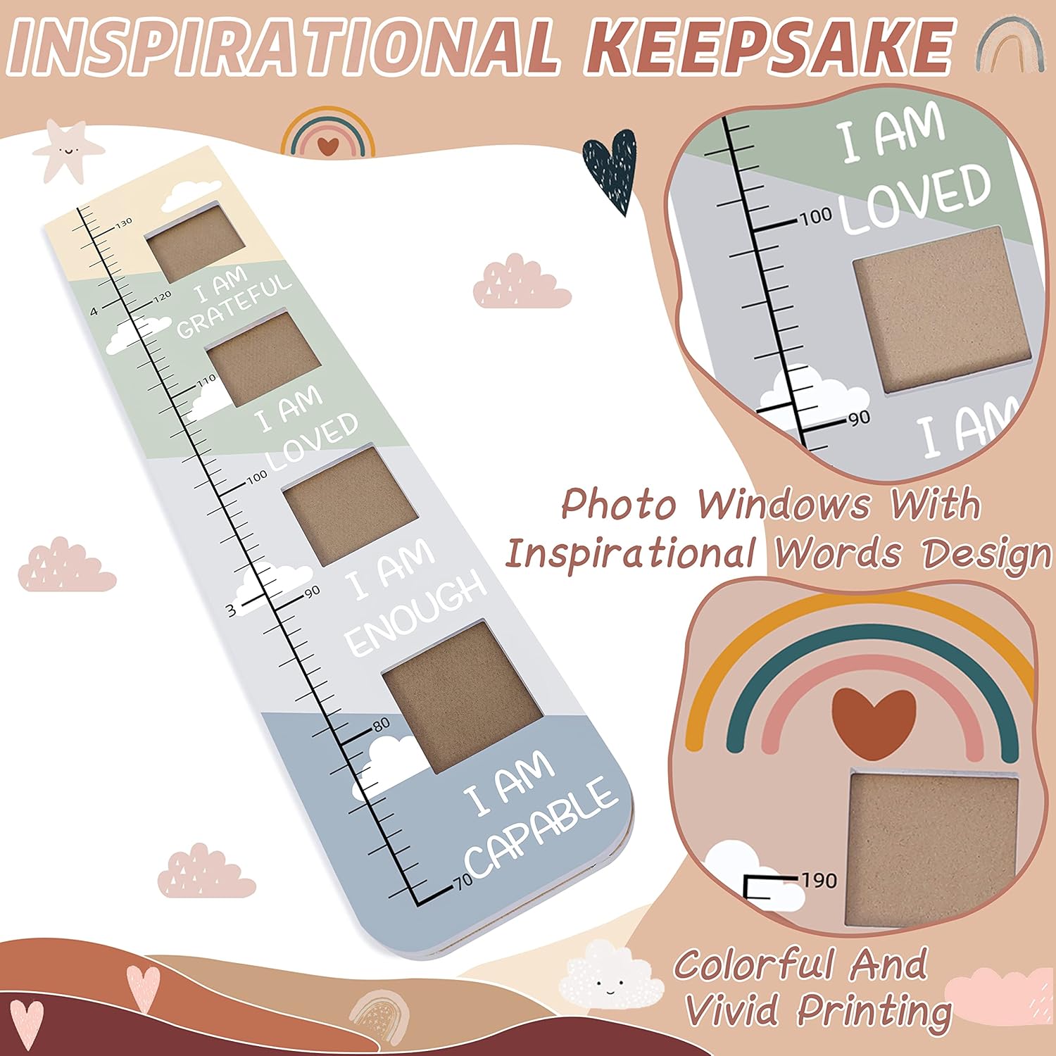 • ❤️【Grow With Encouragement】This height measurement for wall is printed in rainbow colors with elegant boho style, designed with some uplifting and inspirational quotes. It has 8 photo frames, each window freezes a moment of your child's growth and tells the story of your kids. It's like a book of your childs, leaving a unique and eternal memory. This inspirational wall art will not only help to make kids' rooms more interesting but also encourage your children to believe in themselves.