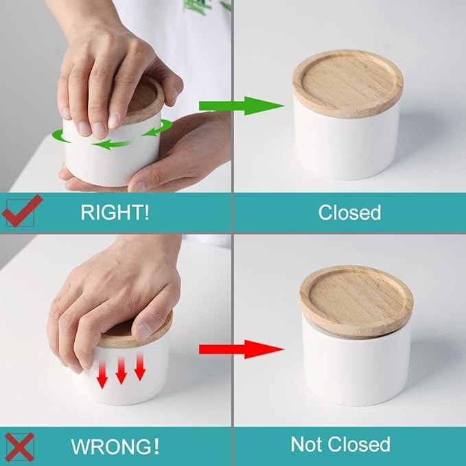 • Precautions for Use - The original wooden lid has a slight odor what doesn't affect the use. Airing several times will disappear. When sealing, rotate and press the lid at the same time. Lids are hand wash only. Canisters are microwave and dishwasher safe.