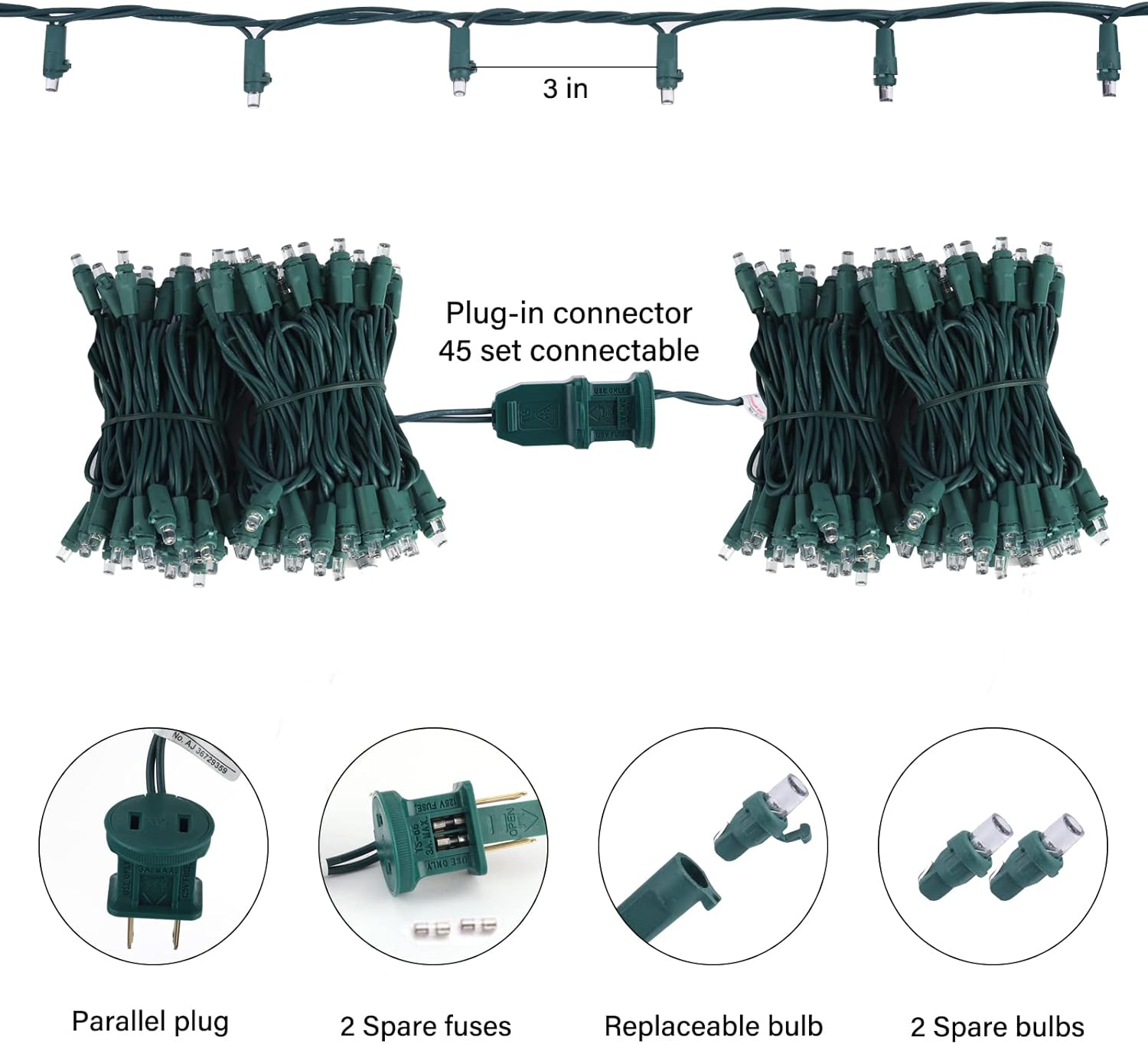 • 【Extensible End-to-End Connection】The total length of 26.5 feet of LED lights allows you to connect up to 45 groups (4500 lights) end-to-end, if one of the strings burns out, the rest of the strings remain on, for extra peace of mind, each light string comes with extra bulbs and replacement fuses, so you don't have to worry about burning out or overloading your bulbs. Note: The AC plug is not waterproof, it should be protected from the rainy day