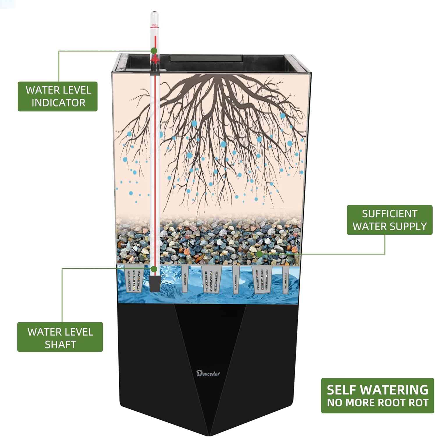 • SELF WATERING & NO MORE ROOT ROT - The smart unique sub-irrigation system is one of the most appealing aspects among all Dexceder planters. The easy-to-use separated integrated water reservoir or catcher- keeps your soil well aerated and automatic supplies plants with the right amount of ongoing moist air & nutrition for optimal growth. The insert indicator shows you the exact time to water again. The full water supply period can single-handedly last over 1 month based on different live plants