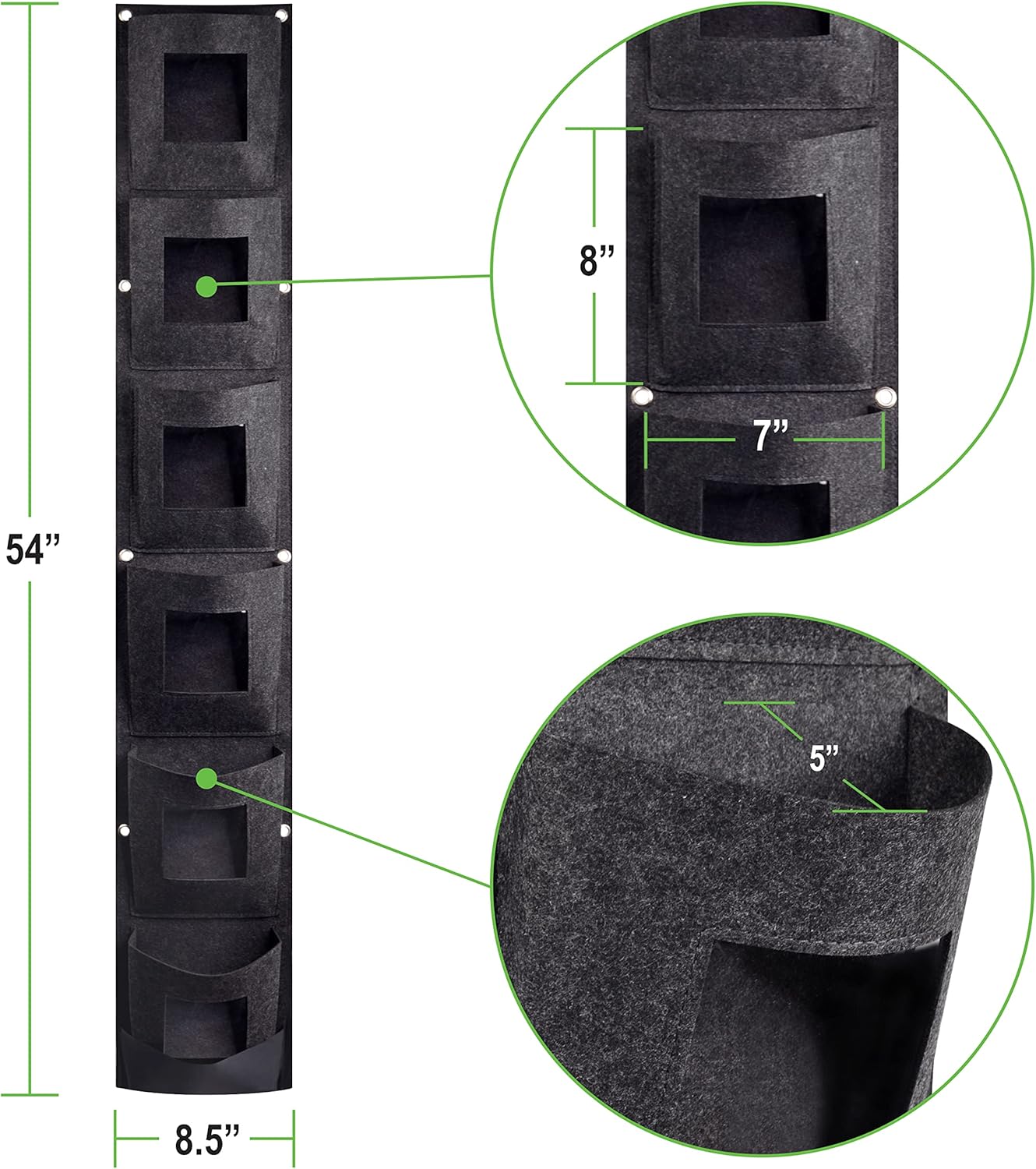 • [Deep Vertical Garden Planter Pockets] - Built with Felt Fabric material, the 6 spacious, strong pockets each measure 7" L x 5" W x 8" H. The strong, liquid-absorbing fabric combined with the heavy-duty grommets make each pocket formidable and supportive for soil, water, plants, fruits, vegetables and more. Comes with 1 hanging planter. The full grow bag measures 8.5" L x 5.5" W x 54" H and acts as a living wall.