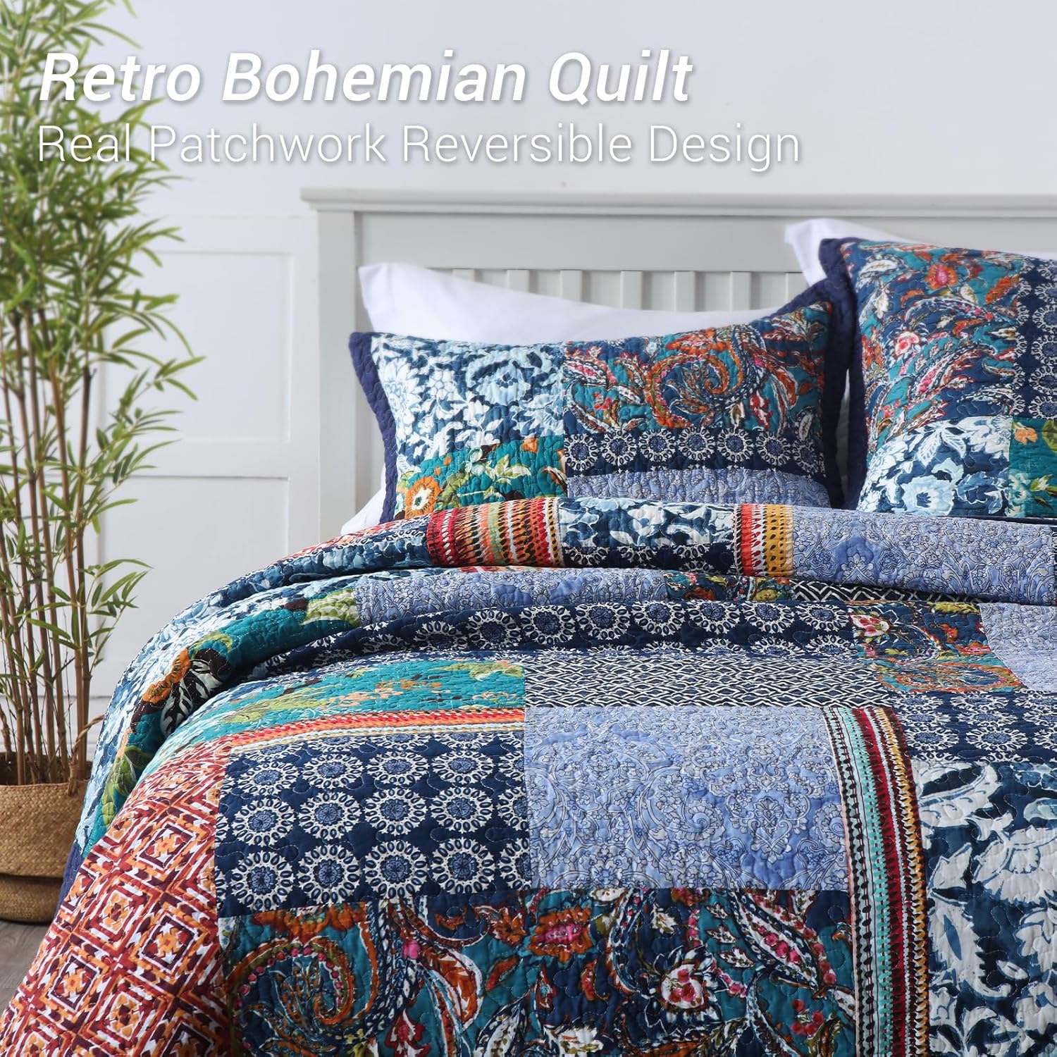 • REVERSIBLE UNIQUE REAL PATCHWORK DESIGN: The real patchwork quilt set is made of different patterns pieces sewn together. The quilt set is reversible design; its A side is designed with bohemian paisley patchwork and its B side with classic medallion. The special bohemian design fits for any decoration and will brighten your room. It is a great choice to send it to your families and friends.