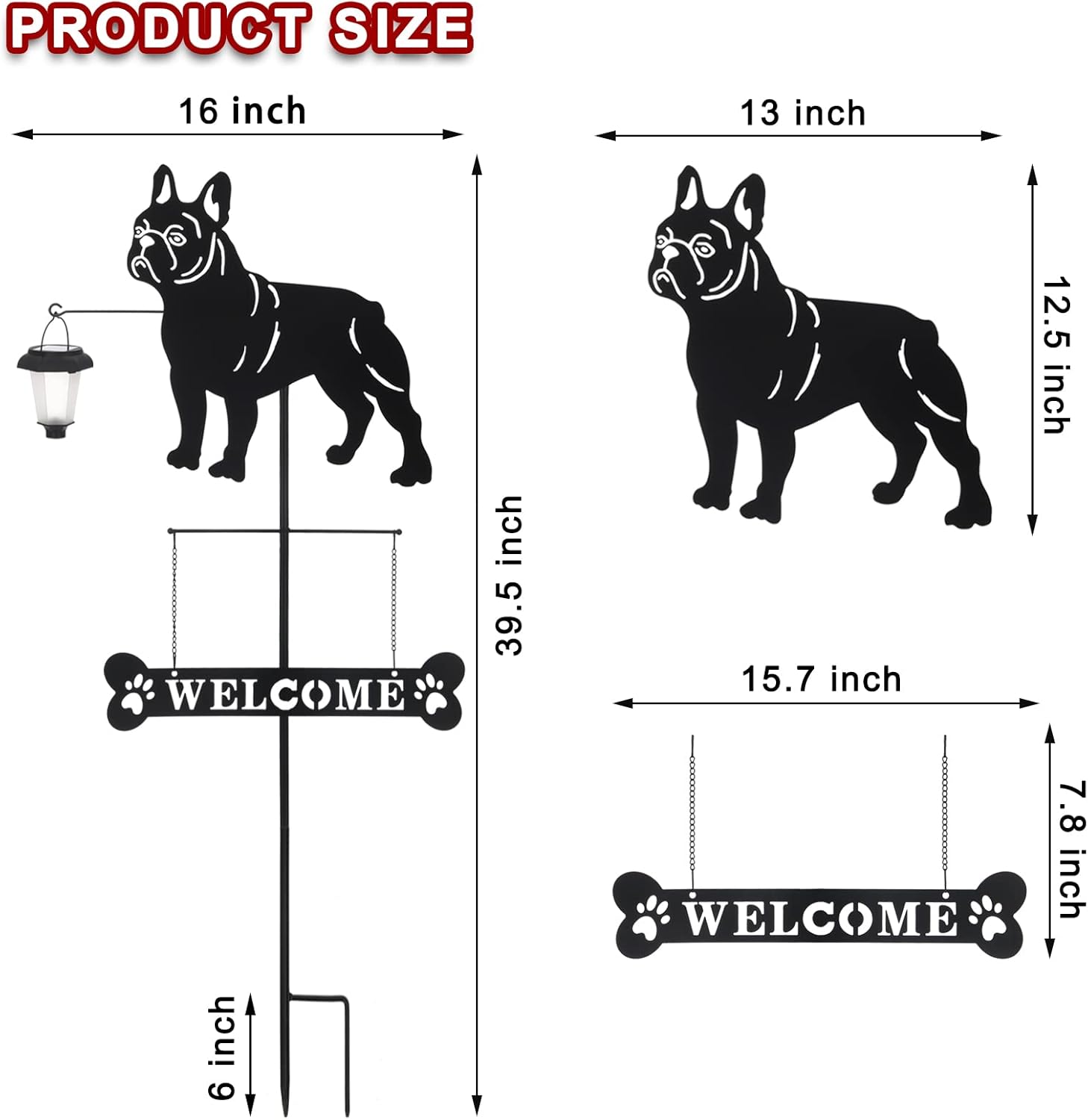 • French Bulldog Welcome Sign: This 39.5’’ adorable metal stake features the silhouette of a friendly french bulldog holding a lantern. A bone-shaped “WELCOME” sign with two dog paw prints will bring a smile to everyone who visits your home. Enhance your home or garden with your favourite breed.