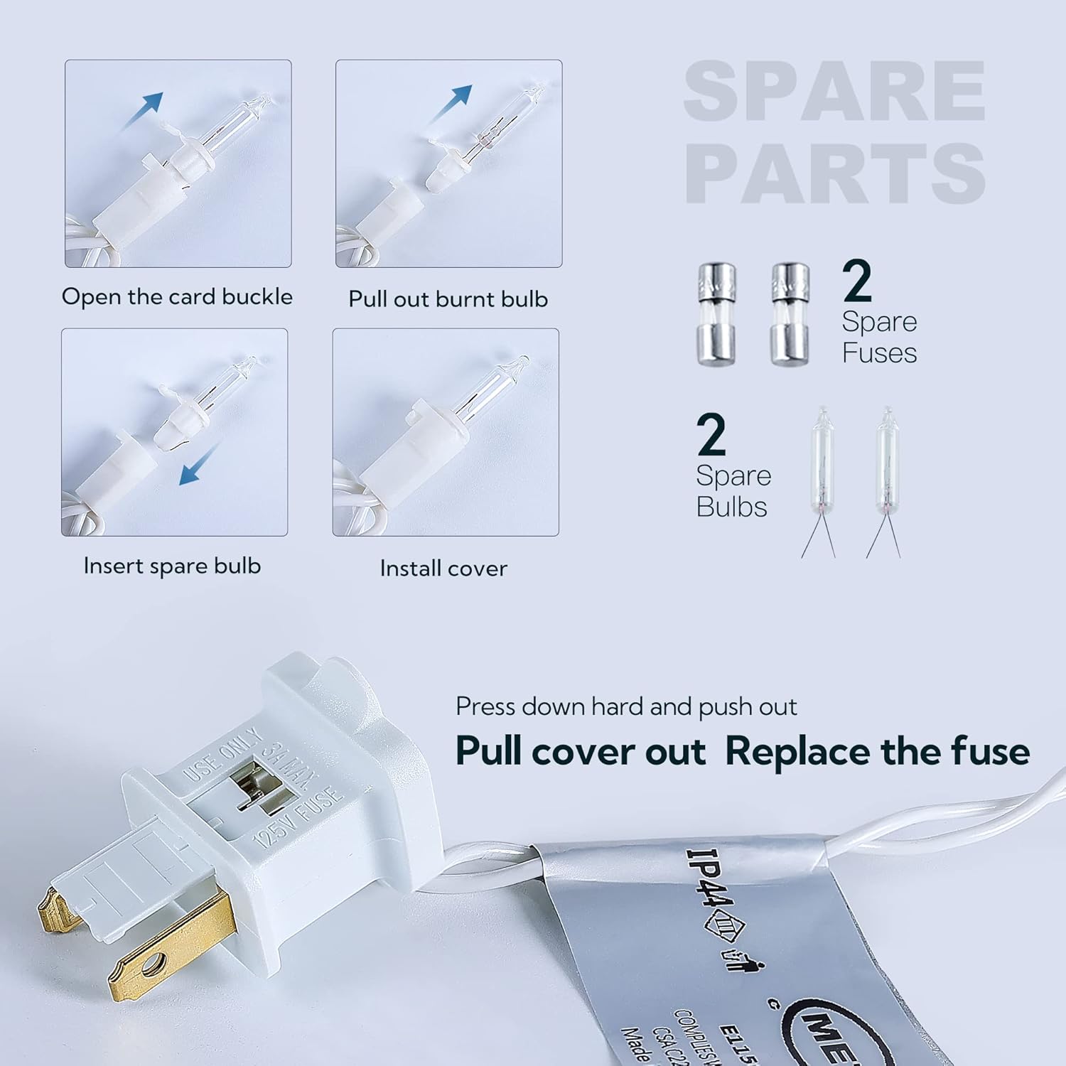 • ⛄Unique Design incandescent mini Lights: The bulb has a snap-on design and is very easy to replace. When one of our bulbs breaks, it doesn't affect the other bulbs. This is a very special design. You can replace damaged bulbs individually with the spare bulb or fuse provided by us.
