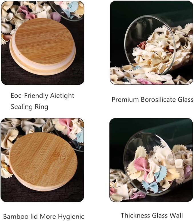 • 【Keep Your Food Fresh】 Glass jars with bamboo lids, airtight with a harmless silicone loop around the wood cover, create a moistureproof environment to keep your dry food inside clean and fresh, locking out air moisture and bugs.
