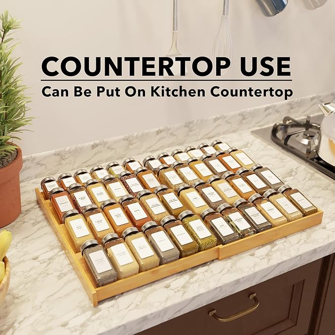 • STURDY CONSTRUCTION - The drawer spice rack is made of durable solid bamboo; Live an organized and sustainable life with this bamboo seasoning drawer organizer