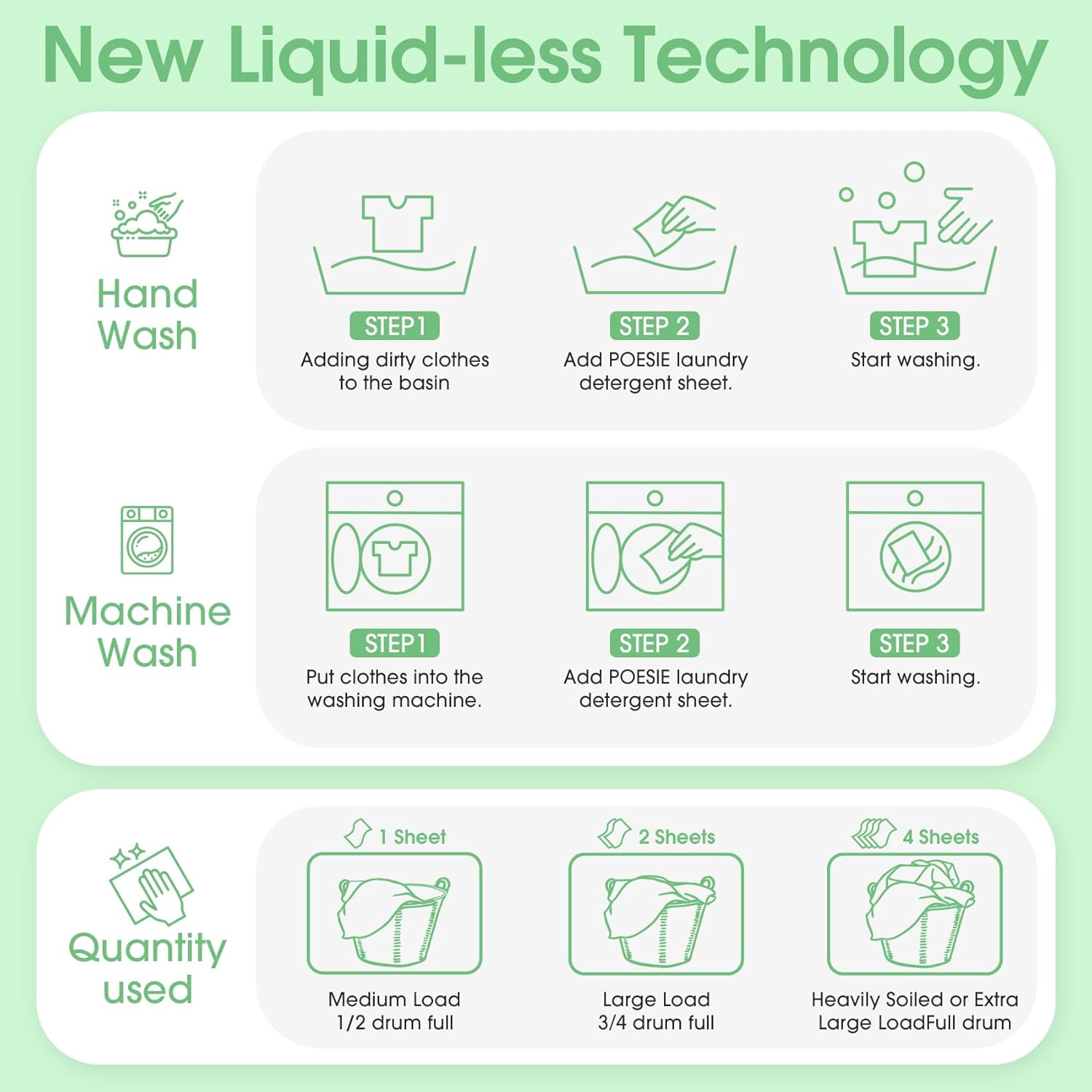 • Easier to Use - Liquidless detergent sheets, 1 sheet for small or medium loads where clothes are not very dirty, 2 sheets for large loads and 4 sheets for extra large loads, no waste. Not too little and not too much to save resources
