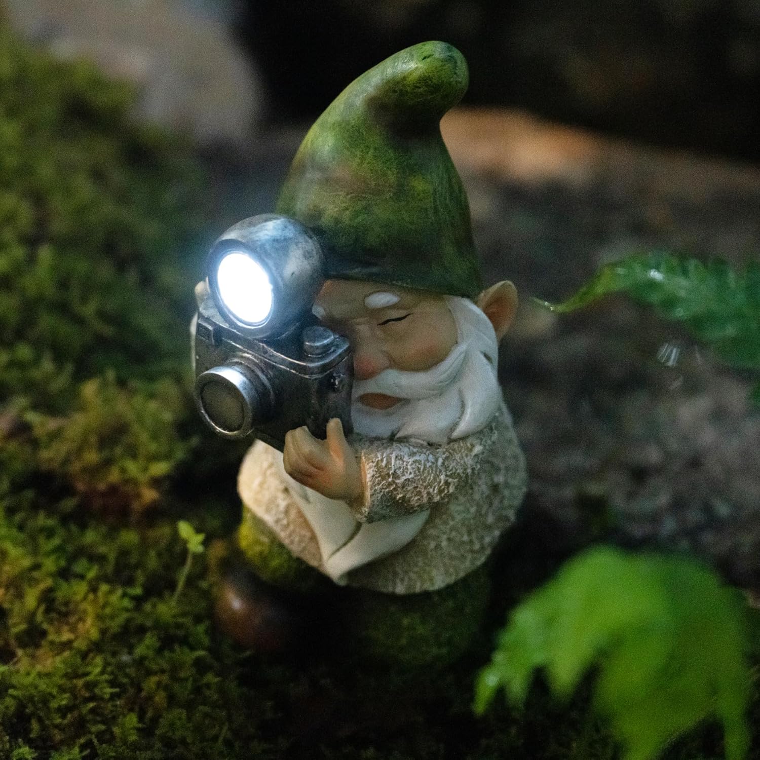• 【 SOLAR POWERED OUTDOOR GNOMES 】This solar gnome statue has a unique photo pose design,that emits a warm and bright glow after the sunset. Place gnomes garden decor under full sun to absorb sunlight during the day with the quality built-in solar panel. Just toggle the bottom switchand leave it in the ‘on’ position in the daytime. The solar panel will charge within 5-8 hours during the day and light up automatically at night for 8-10 hours