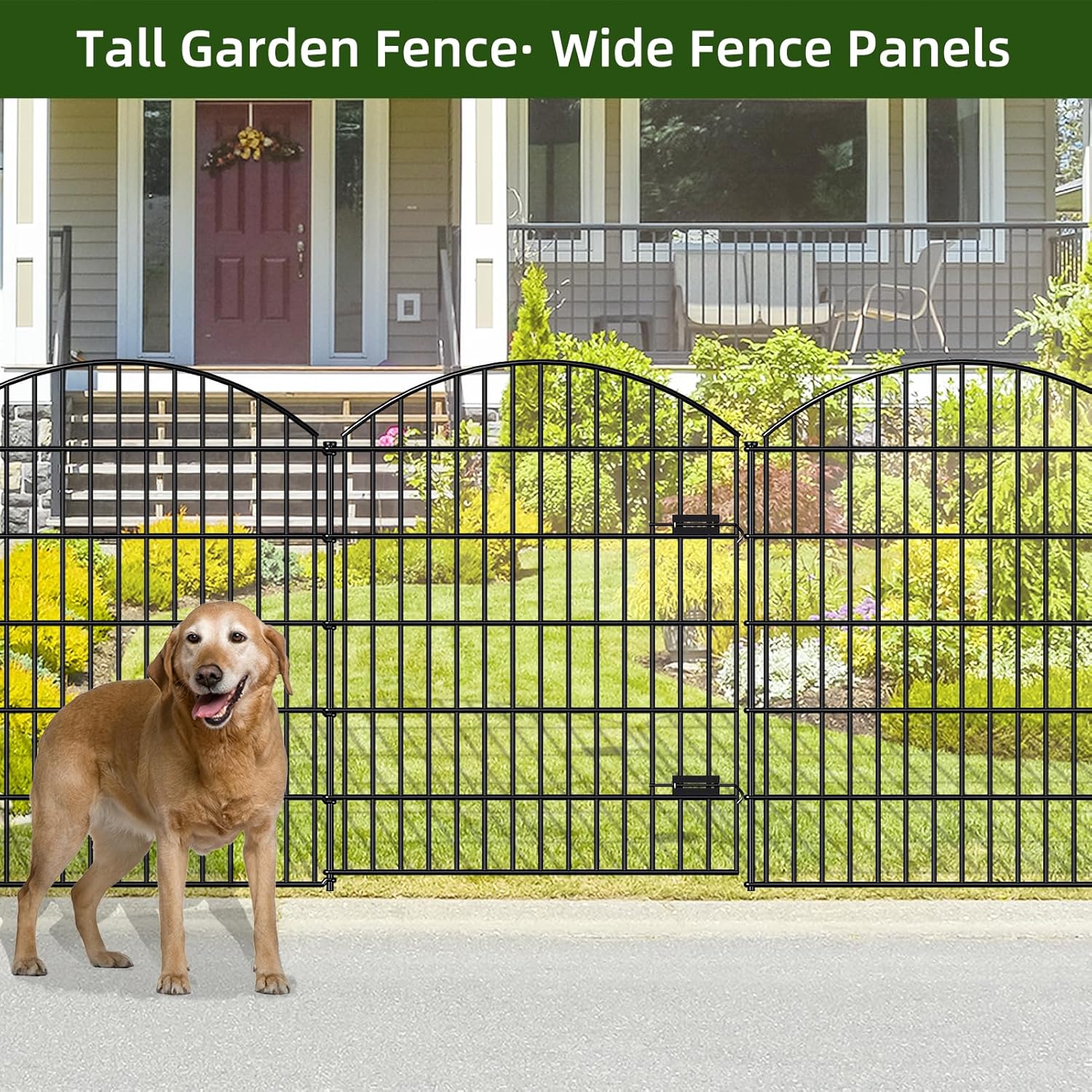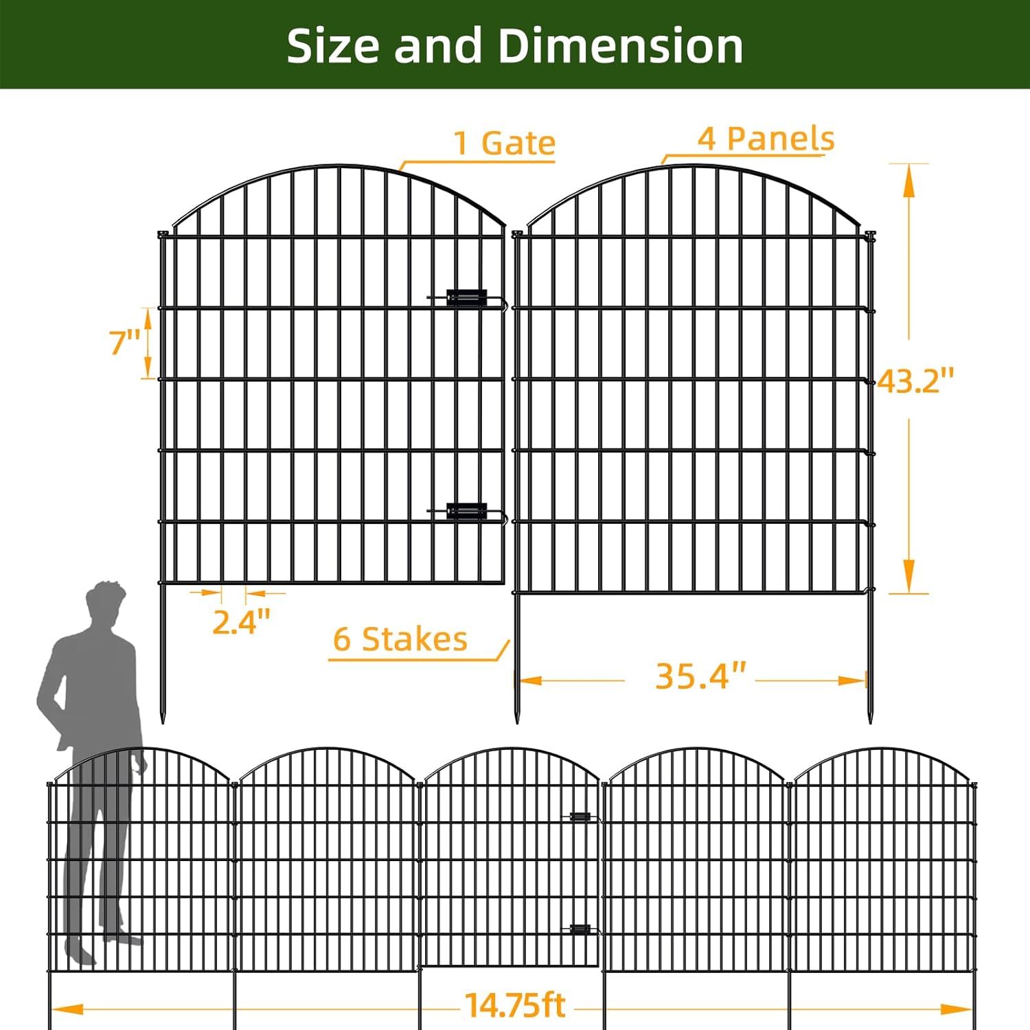• WHAT'S INCLUDED: 1 Gate+4 Fence Panels+6 Stakes in a bundle. Gate sized 34.7"Wx42.2"H, each Fence Panel sized 35.4"Wx43.2"H, each Stake 49.2 inches Height, linear length 14.75 feet, Black color.