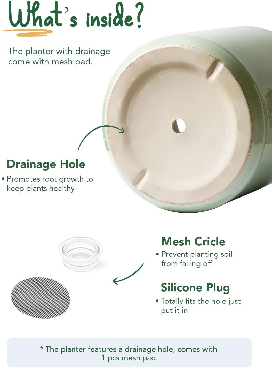 • Silicon Plug, Drainage Hole, Net Included: To drain or not to drain, it's all up to you; Roots love moisture but are afraid of excessive water; Use a silicon plug to prevent water leakage, or cover the drainage hole with a mesh pad to prevent soil loss, offering good ventilation for plants to breathe freely (Plant is Not Included)