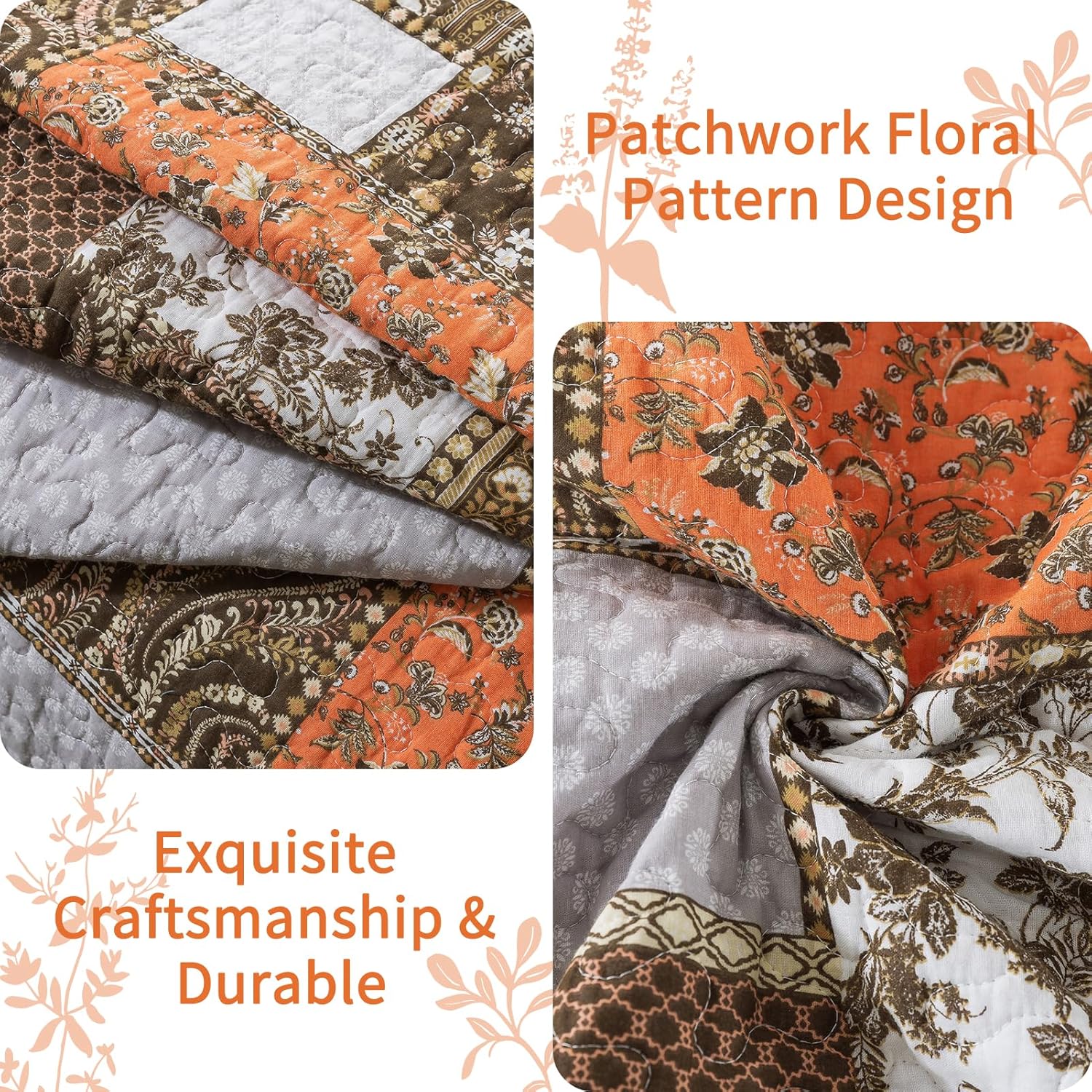 VAPUTAR Quilts King Size - Fall Cotton King Size Quilt Bedding Set, 3 Piece Lightweight Soft King Bedspreads Cotton Boho King Quilt Set, Floral Bedding Set for Farmhouse Bedroom (Dream Orange)