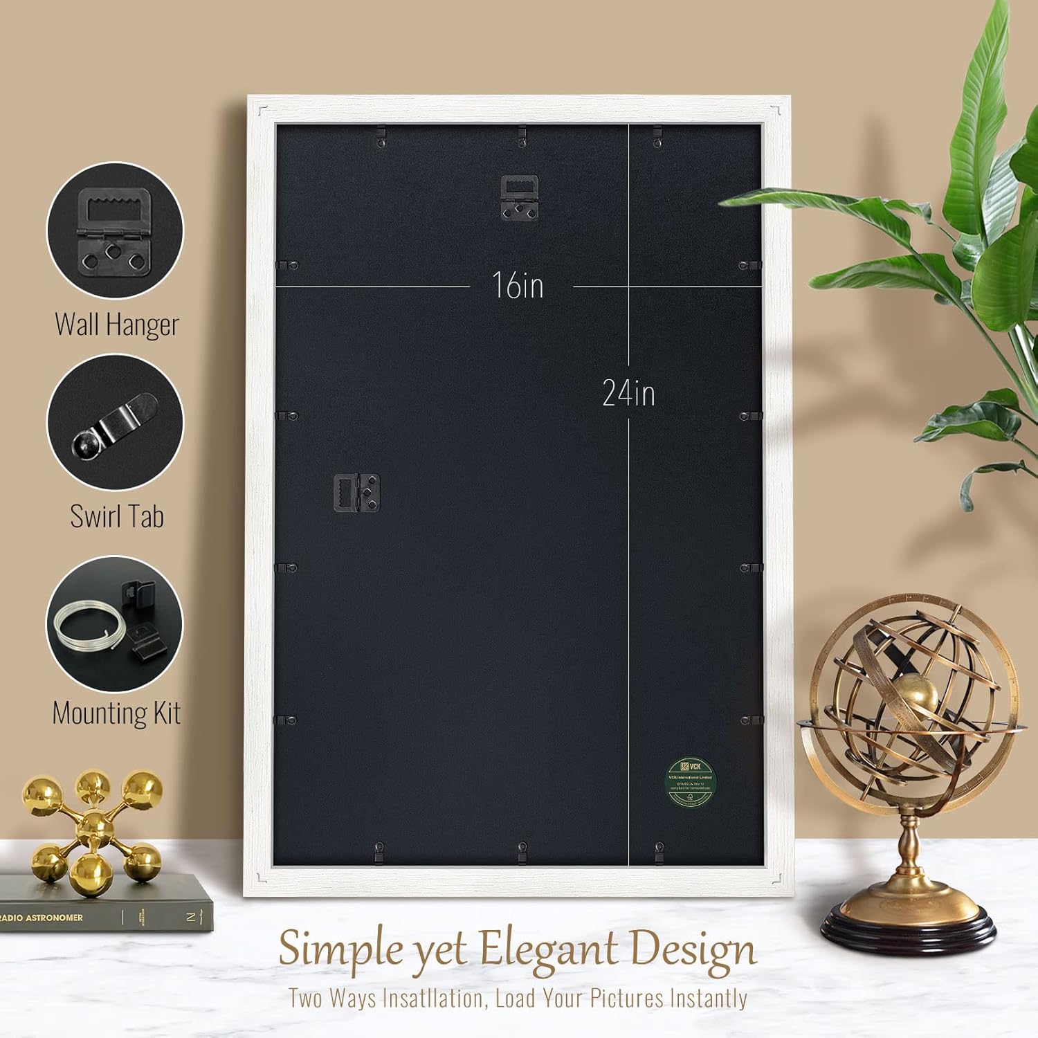 • PRODUCT FEATURES: The overall size is 25.8”x17.8” for Pictures 16x24 or 24x16, horizontal/vertical for table or wall display. Unlike others, special swirl tabs make the frame super easy to load pictures.