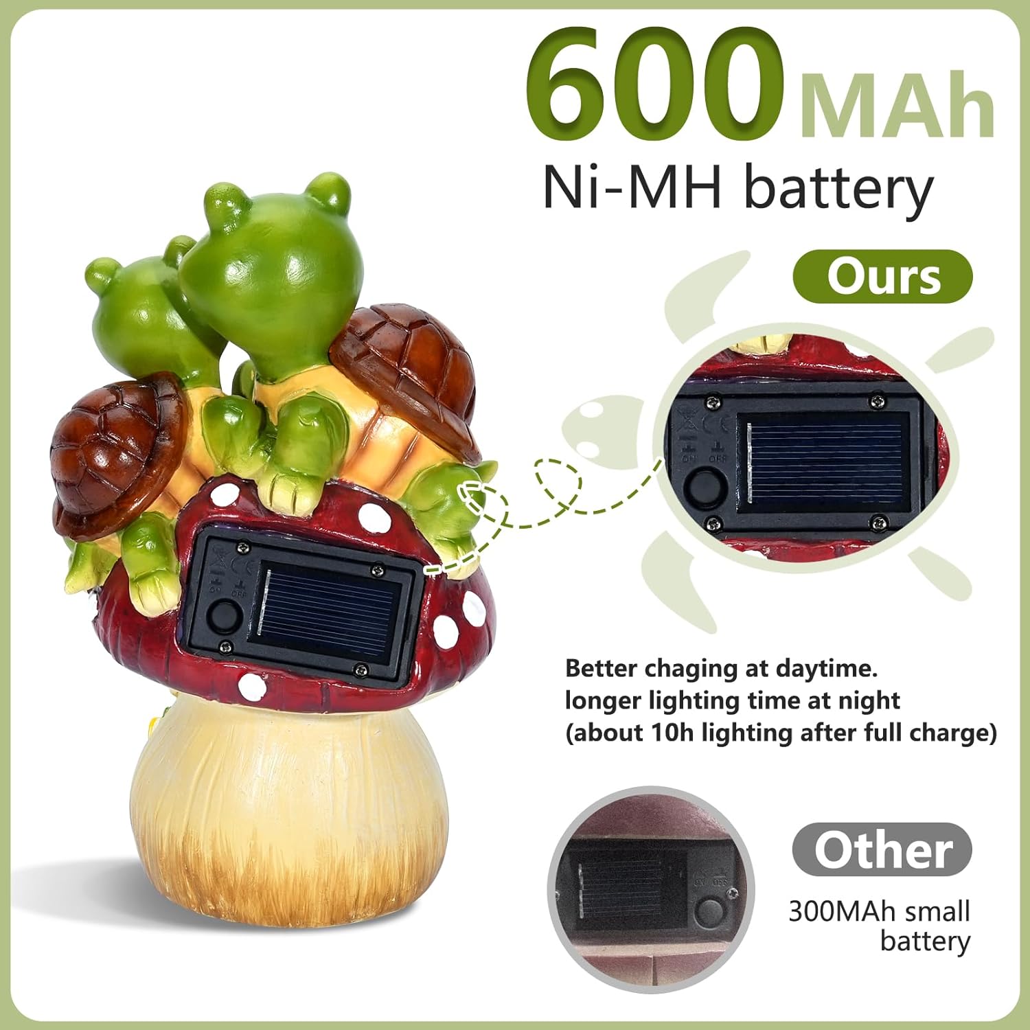 • Solar Light Garden Statue: Our cute turtle mushroom statue will decorate your yard not only during the daytime, but also at night. 1.2V AAA 600mAH Ni-MH Battery - runs about 10 hours on a full charge of sunlight