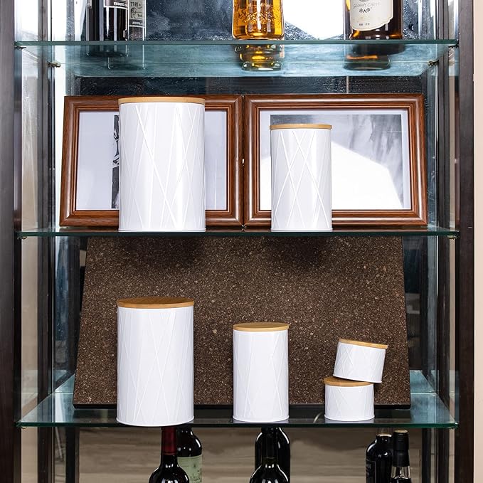 • MATERIAL: FavorFlavor Canister set is made of galvanized and all-natural bamboo and latex-free natural rubber (food grade and BPA-free). The metal won't break as easily as glass or ceramic, it's strong, lead-free, and non-toxic to keep your kitchen essentials safe.