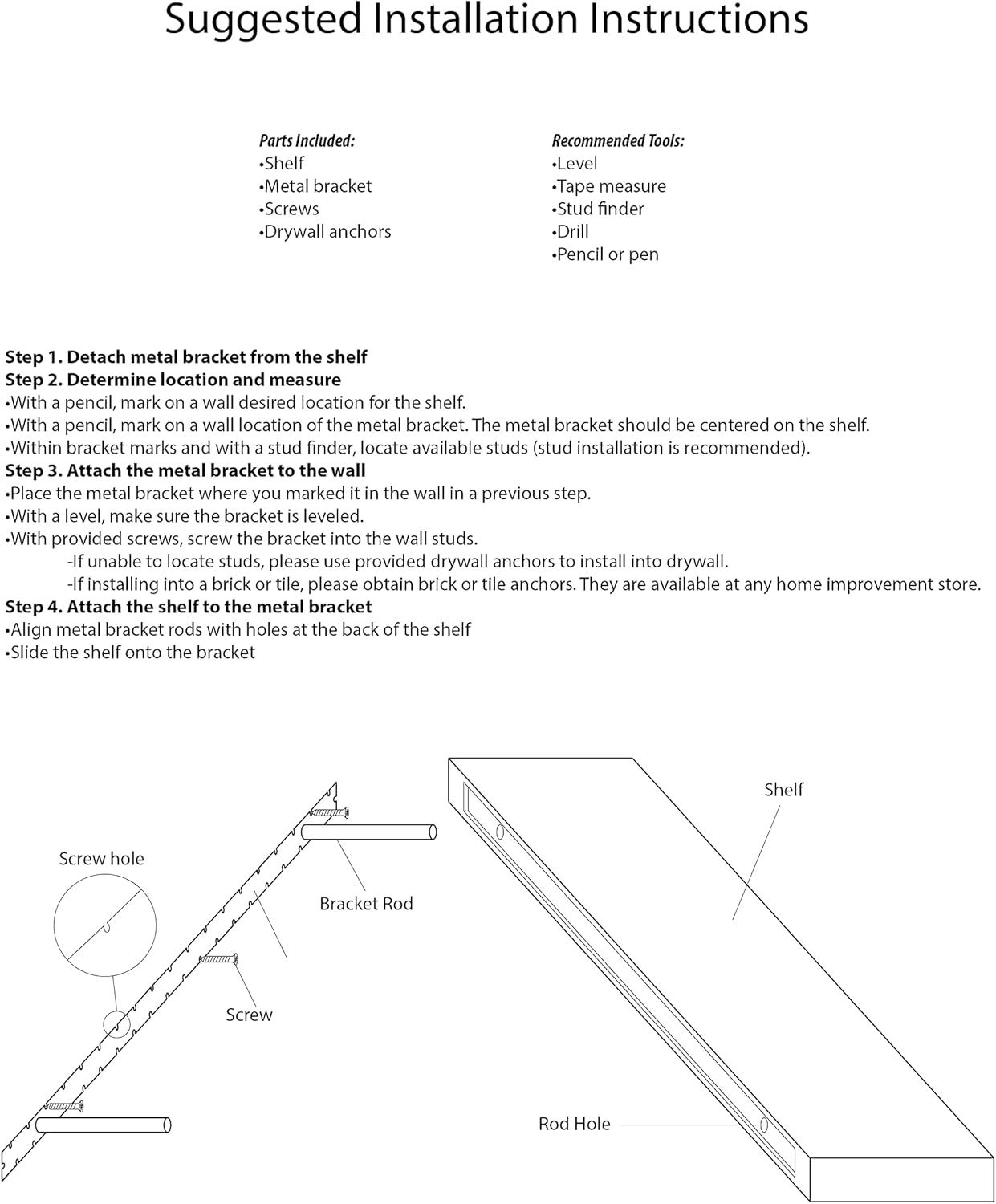 • WHAT YOU WILL GET: Shelf, installation bracket, screws, and anchors. To make the installation process effortless and quick, you will need: Tape measure, Stud finder, Pencil, Level, & Drill.