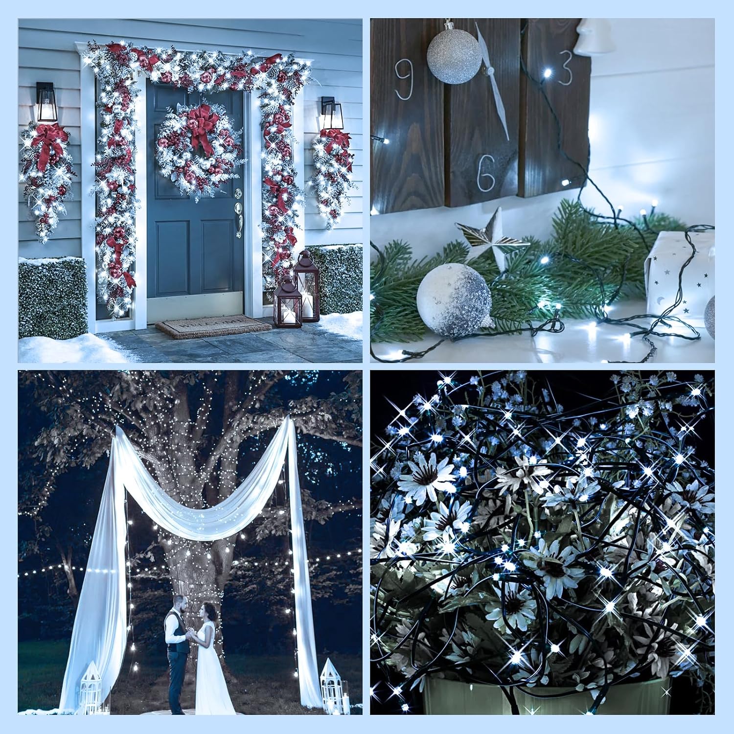 • Upgraded LED String Lights Indoor Outdoor: Super bright with new upgraded LED bulbs. The extendable 100 LED cool white green wire plug in string lights have 8 lighting modes get decorative effect. Total length is 42.8ft, of which 33ft with lights.
