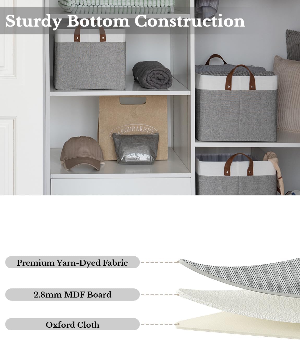 • Premium Quality: Made from high-quality fabric and reinforced with a heavy-duty MDF bottom board and a sturdy metal frame. The solid construction enables the storage bins to stand upright without support, even when empty.