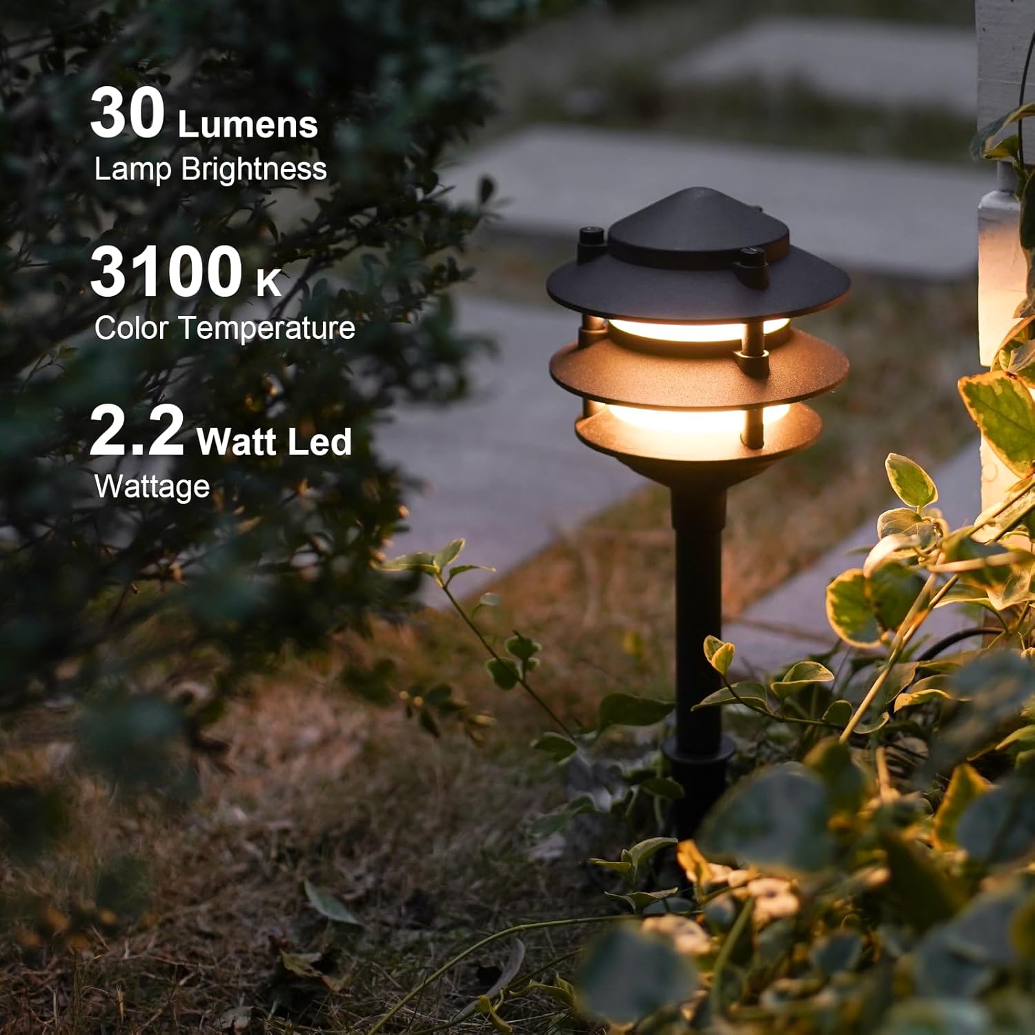 • ✔4PK 12V AC PATHWAY LIGHTS: These 4PK low voltage path lights use 2.2 watt led chips with 30 lumen brightness. You will like the 3 tier pagoda shape, a refreshing option from other shaped landscape lights