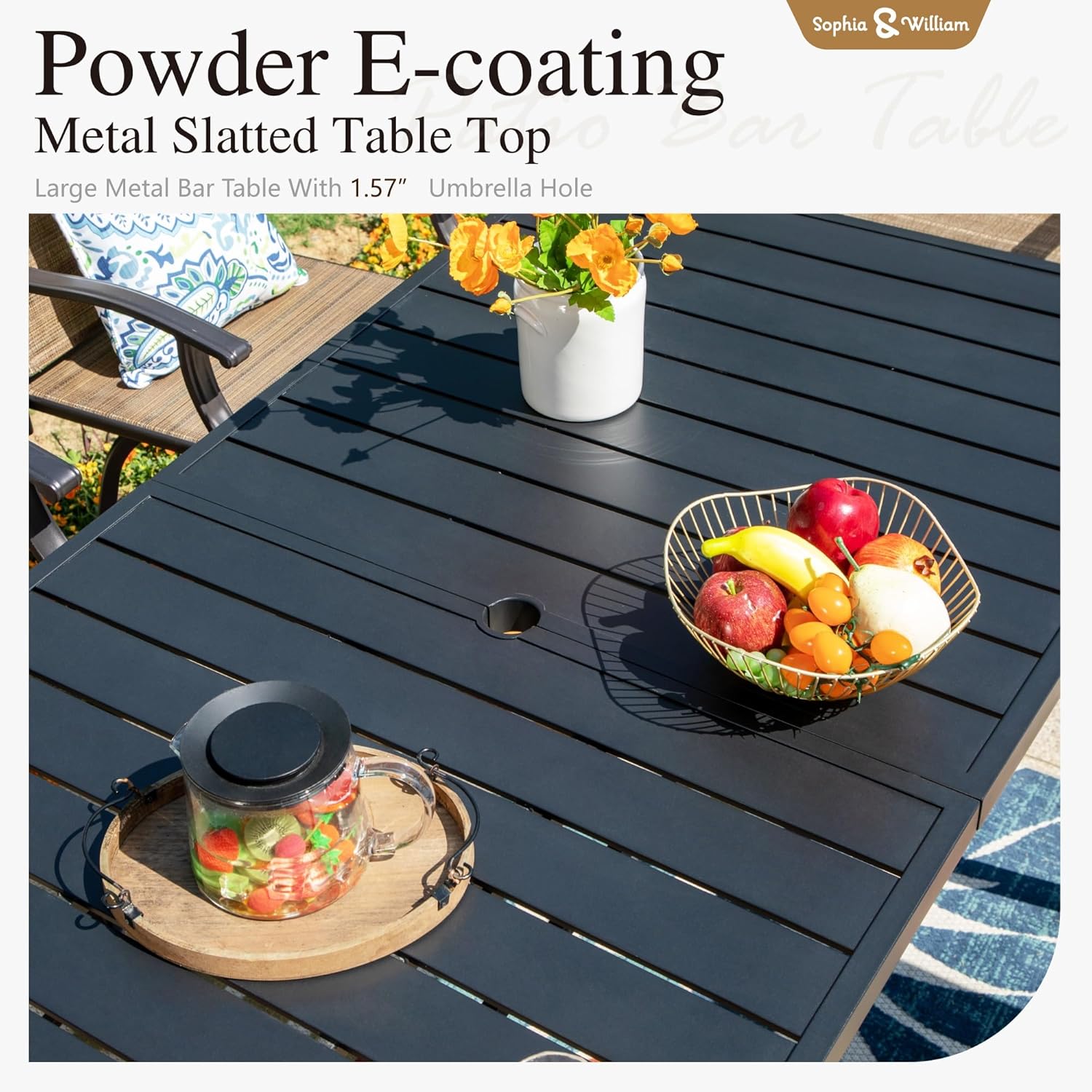 • 7 Pieces Bar set:large 66 bar table with 6 bar chairs, great for your large family enjoy daily leisure time. Sturdy x brace under the table makes it more stable. Umbrella hole design, great for sunshine day use