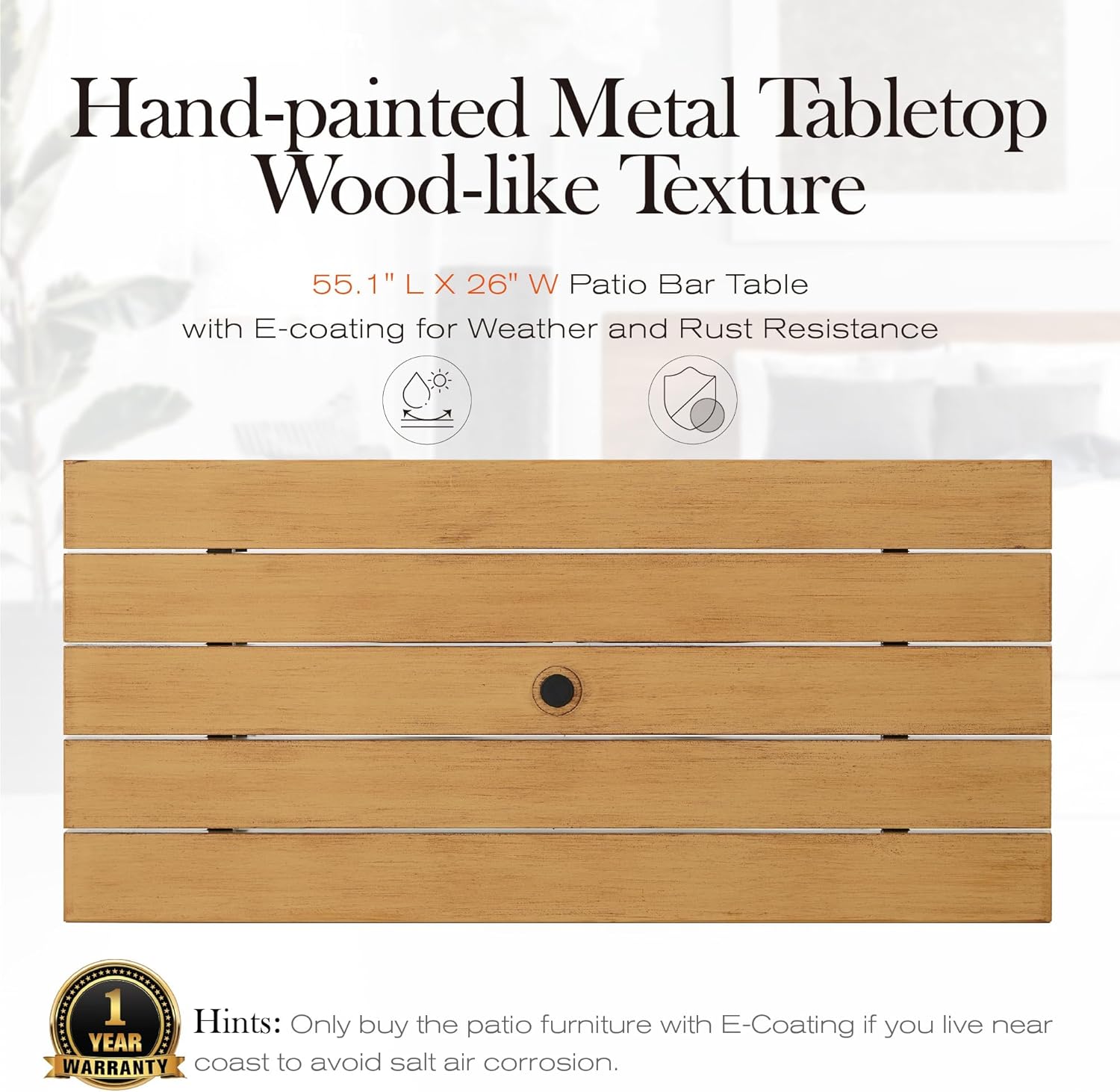• 【Barheight Patio Table and Chairs】Combines ergonomic high back design with seamless swivel functionality, this bar set provides a stylish and elevated seating option that adds flair to any space. Patio bar table features a handpainted tabletop with woodlike texture. Umbrella hole: 1.57