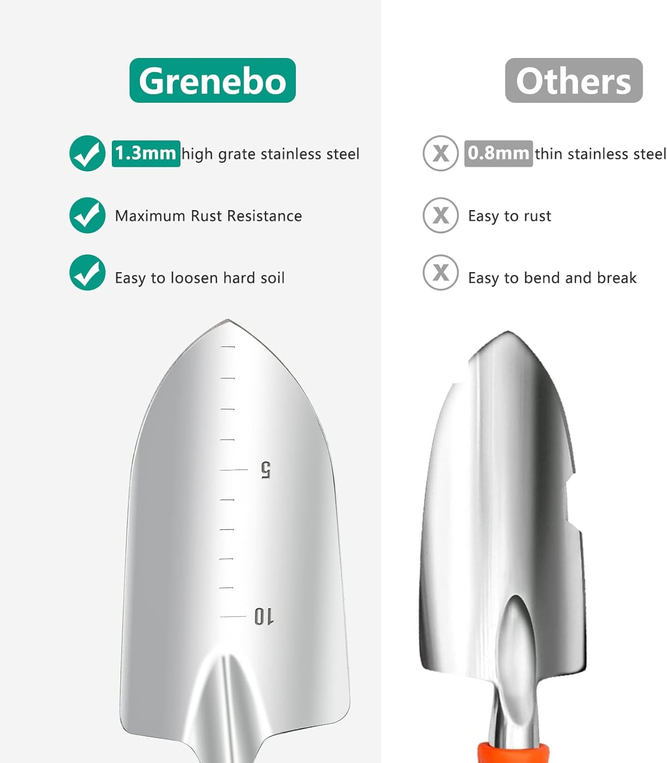 • One for All Package: Grenebo garden tools set includes a total of 8 tools and 1 storage bag. Pruning Shears, Weedier, Transplanter, Cultivator, etc., nearly everything you need in daily garden maintenance.