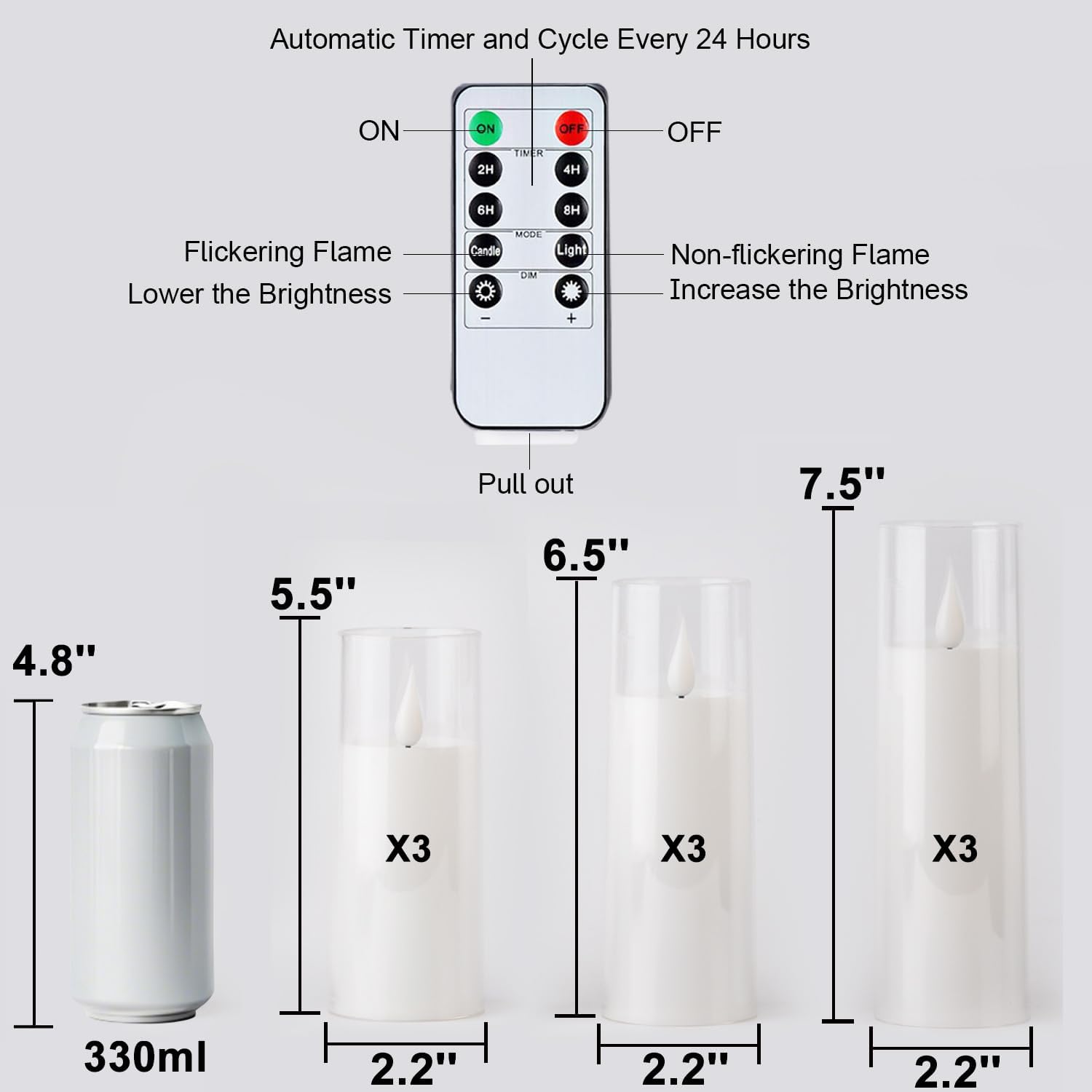 • Package Include: This battery operated candle set includes 9 flameless pillar candles( D2.2”x H5”6”7”), two 10-key remote control, one user manual. Each flameless candle powered by 2 x AA batteries (not included) which can last for 500+ hours