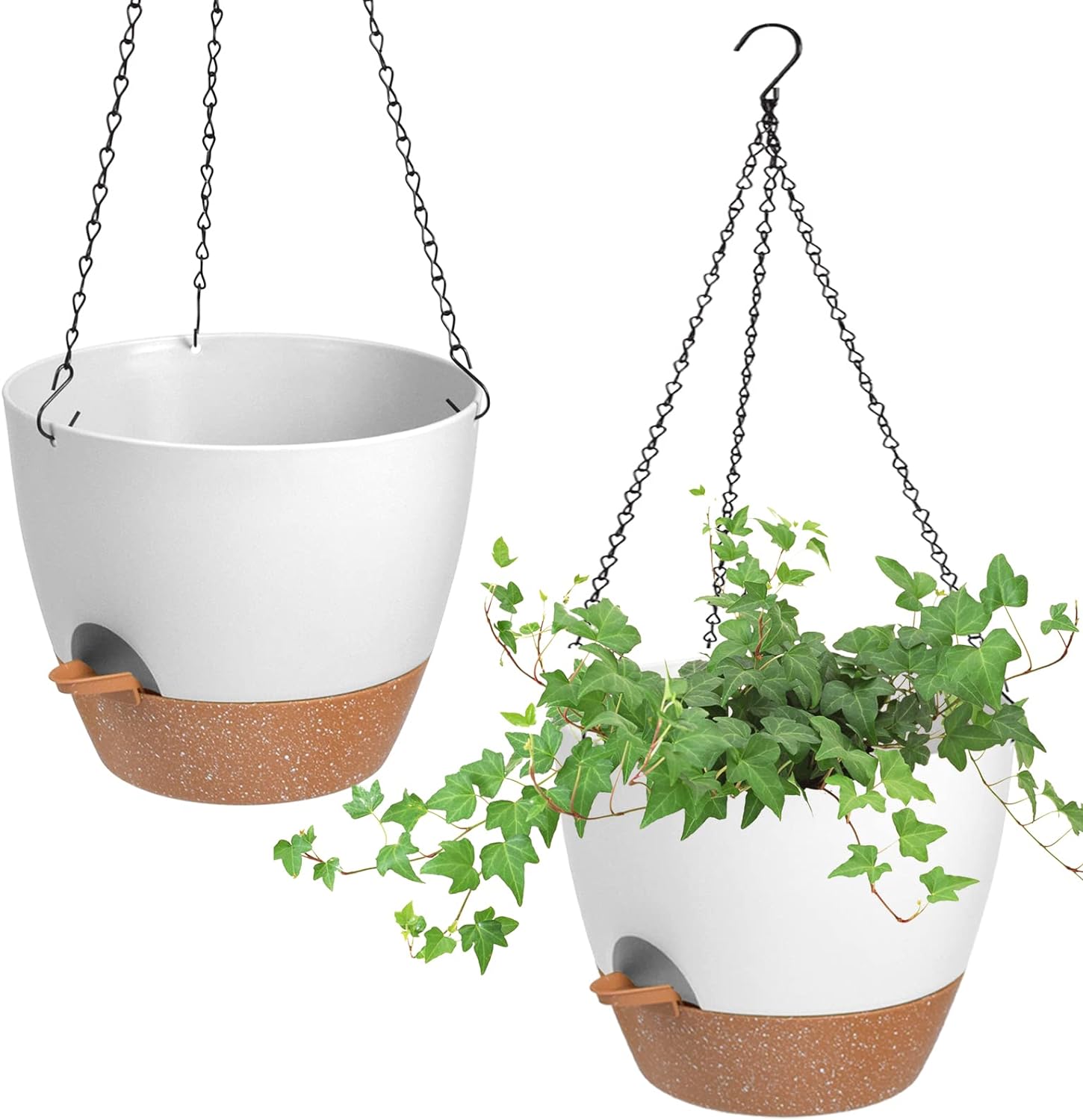 Hanging Planters for Indoor Outdoor Plants, 2 Pack Self Watering Hanging Pot with Drainage Holes & Removable Tray (White, 8'')