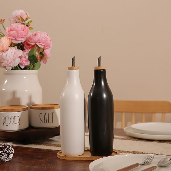 • Ceramic Oil Dispenser Bottles: Set of 2 16.9oz oil bottles made from ceramic material for easy cleaning and dishwasher safe.