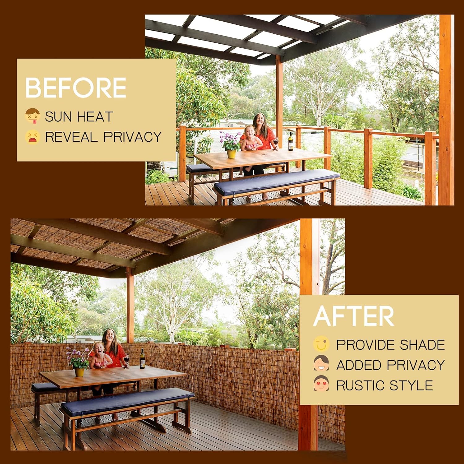 • 【Indoor and Outdoor Use】Natural bamboo fence is environmentally friendly and suitable for indoor and outdoor use. From hiding defective walls and old fences to improving privacy in the backyard/balcony, and protecting pets from jumping out of the balcony, these reed fences are also the perfect decoration for a beautifully decorated swimming pool.