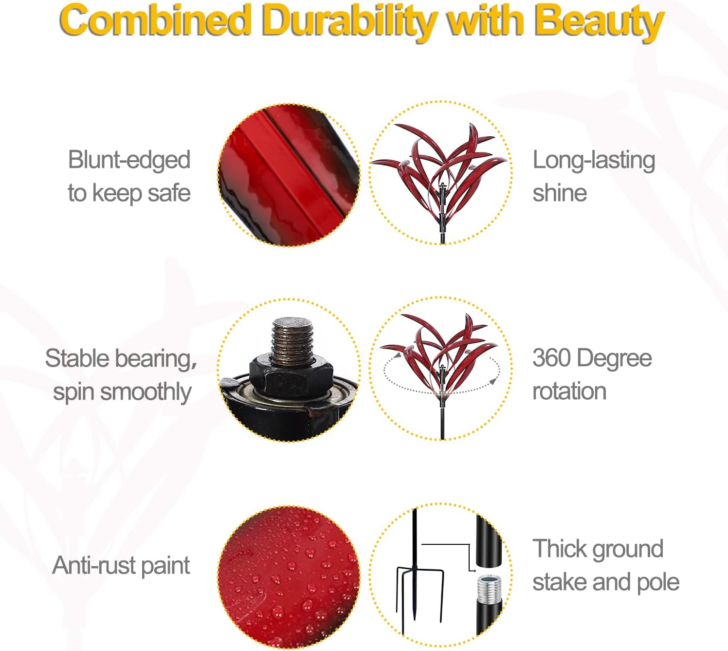 • 【Combined Durability with Beauty】Dual ball bearing movement, 360 Degree rotation, no noise interference.This beautiful garden wind spinner is crafted from sturdy material to last for seasons to come.