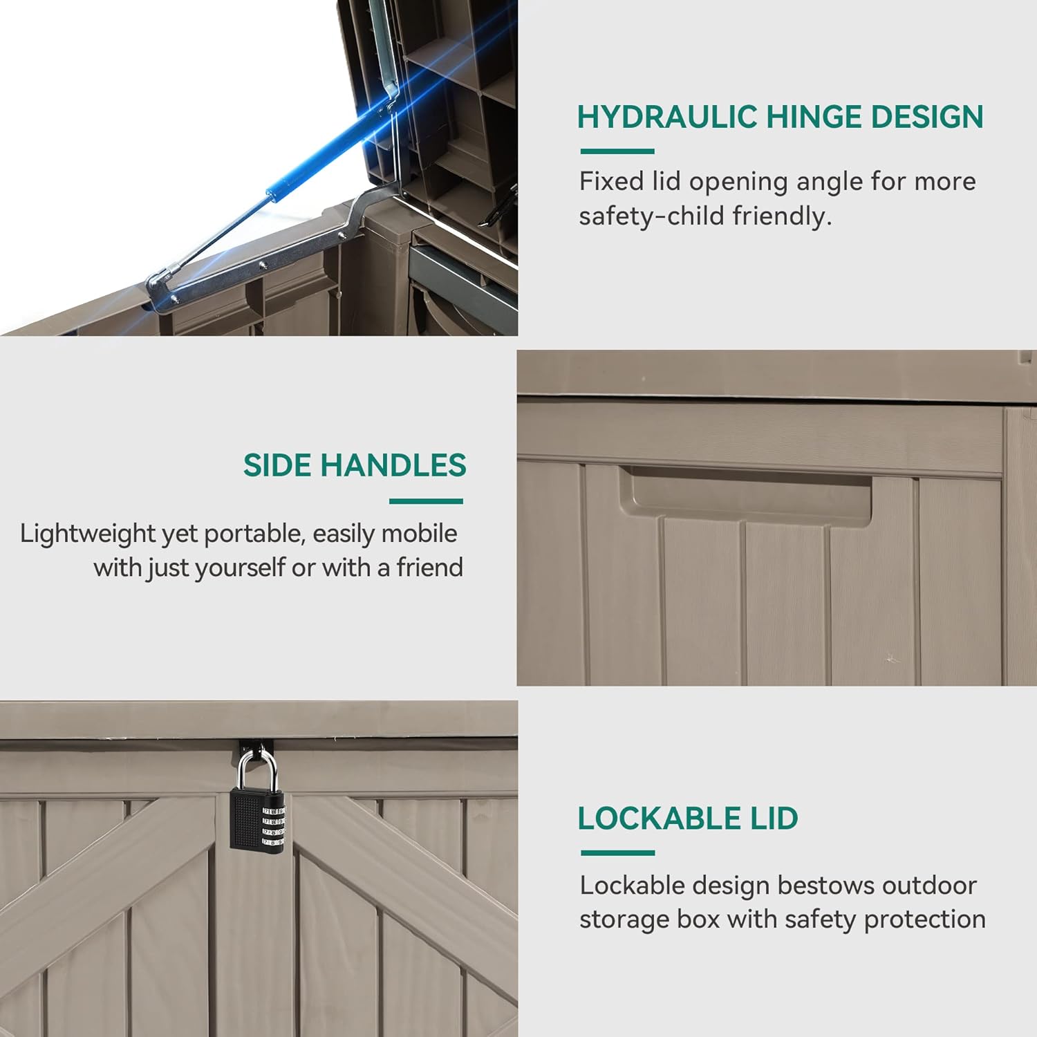 • EASY TO USE- Hydraulic hinge provides smooth, anti-slam closing; It’s easy to reposition thanks to the built-in handles, and secure your items with lockable lid; Two people assembly in 10 mins with tools included.