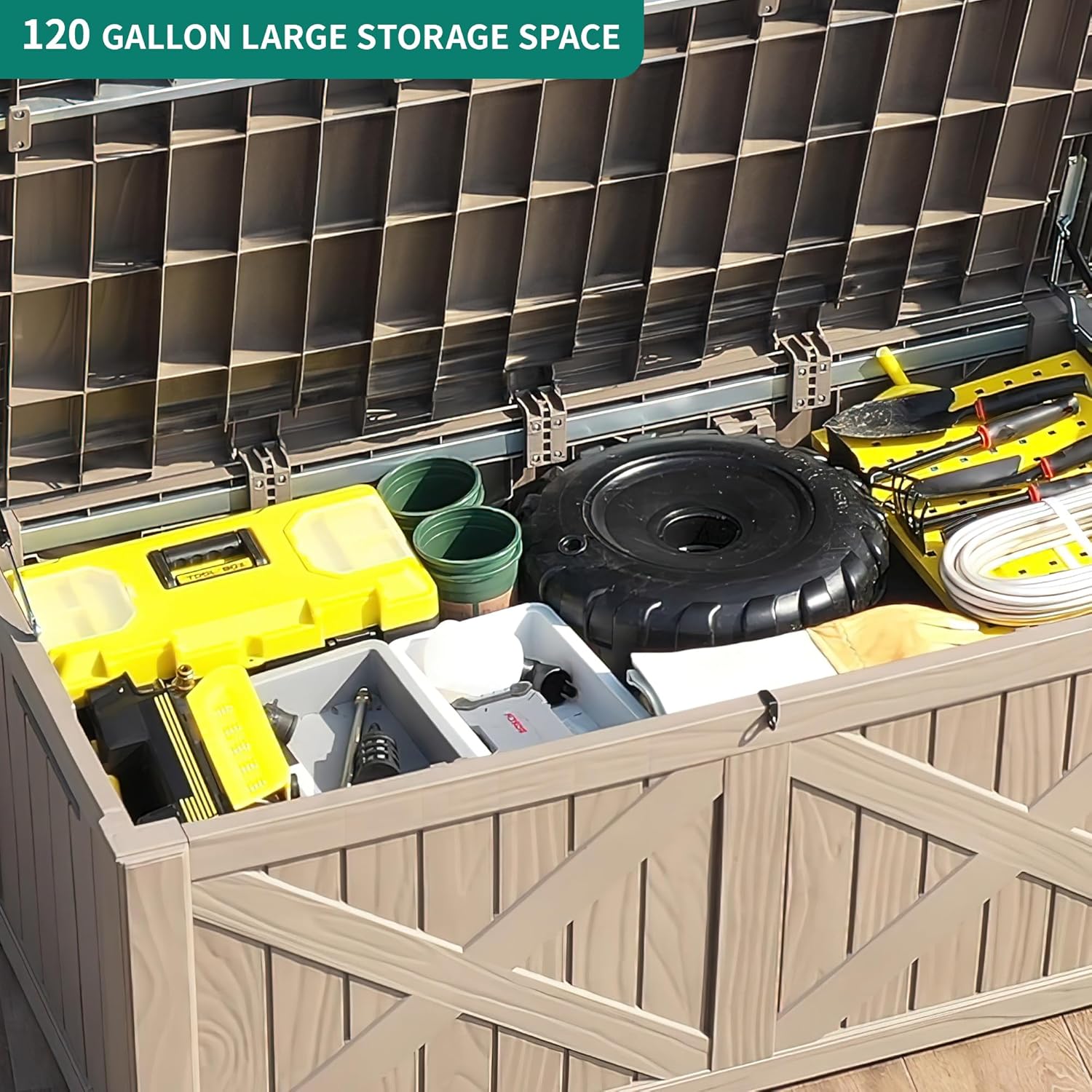• LARGE STORAGE SPACE- 120-gallon capacity results in a roomy storage solution for your garden tools, pool supplies, sporting equipment, etc., on patio, deck, or porch; Featuring 440lbs. weight capacity, this waterproof outdoor storage box can double as an extra table or patio bench to accommodate two adults.