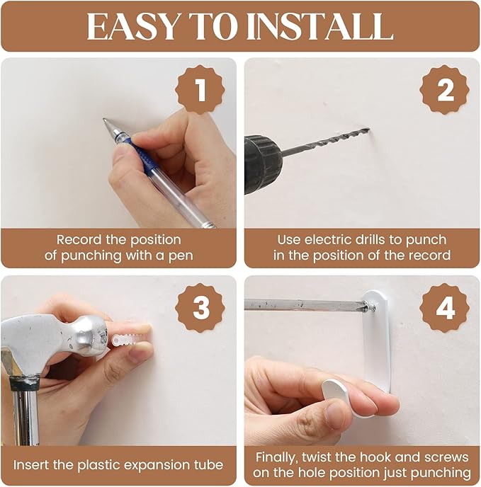 • 【Easy To Install】 - Equipped with 6 strong hooks, including 3 Pcs traceless transparent hooks(bear up to 22 LB), and 3 Pcs White space aluminum hooks, which are needed to drill holes for installation. But it is easy to assemble(The Steps show as the picture). Warm Tips: If you don't want to drill or your product weight is less than 22 LB, you can transparent hooks directly. Save your time!
