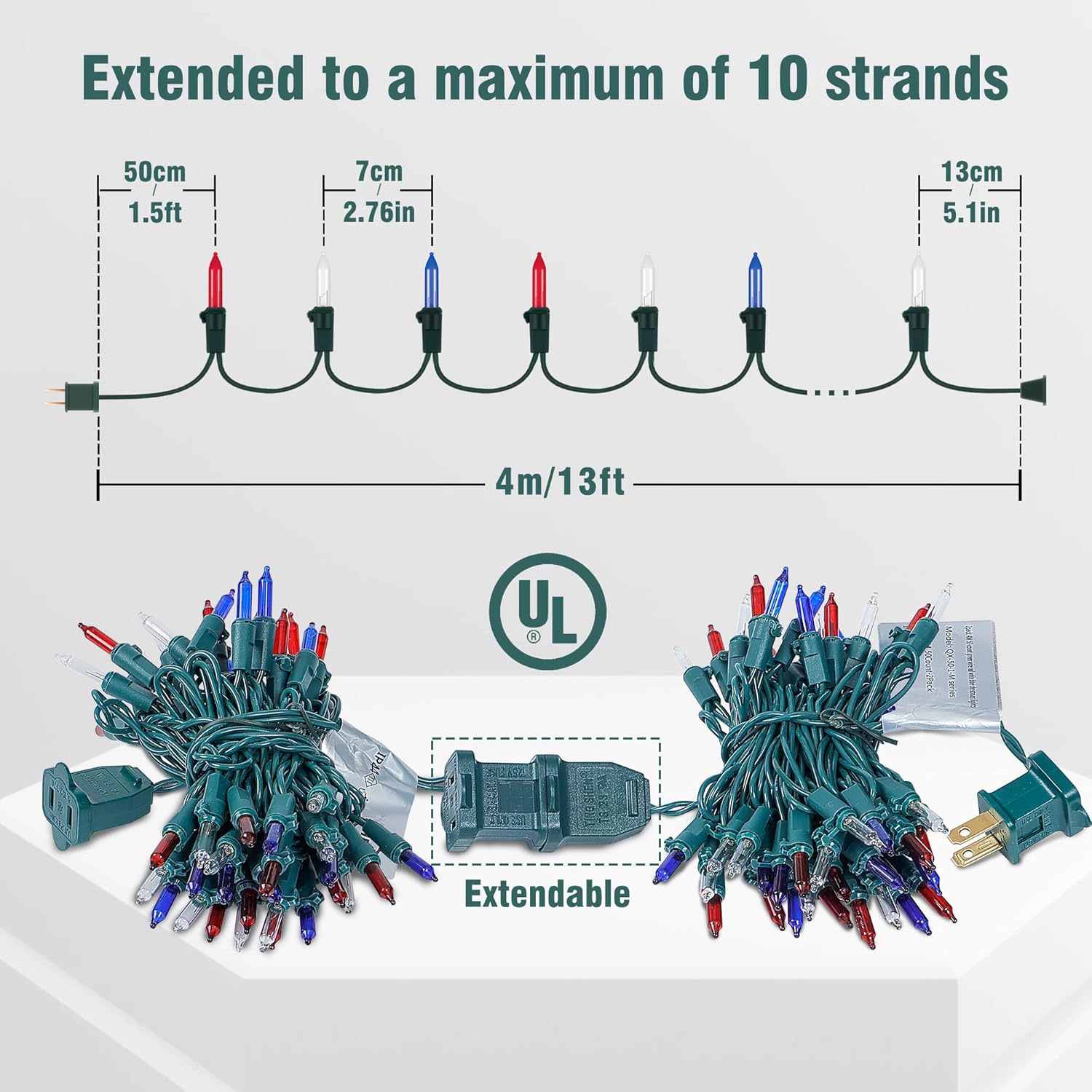 • 100 Count Patrotic Mini String Lights:2 Packs green wire 50count old-fashion incandescent red white blue lights,13ft per strand,2.76inch spacing,1.5ft lead,5.1inch tail.The romantic festivel atmosphere at night to make your home a wonderful sight for your neighbors.